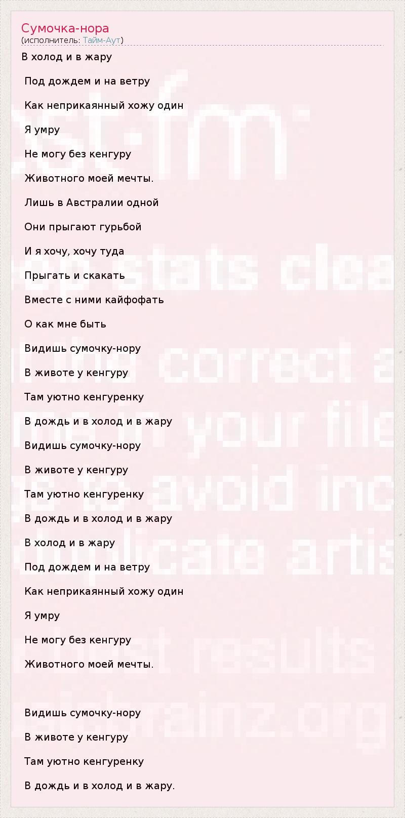 В холод и в жару Под дождем и на ветру Как неприкаянный хожу один Я умру Не могу без кенгуру Животного моей мечты. Лишь в Австралии одной Они прыгают гурьбой И я хочу, хочу туда Прыгать и скакать Вместе с ними кайфофать О как мне быть Видишь сумочку-нору В животе у кенгуру Там уютно кенгуренку В дождь и в холод и в жару Видишь сумочку-нору В животе у кенгуру Там уютно кенгуренку В дождь и в холод и в жару В холод и в жару Под дождем и на ветру Как неприкаянный хожу один Я умру Не могу без кенгуру Животного моей мечты. Видишь сумочку-нору В животе у кенгуру Там уютно кенгуренку В дождь и в холод и в жару.