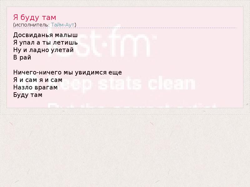 Досвиданья малыш Я упал а ты летишь Ну и ладно улетай В рай Ничего-ничего мы увидимся еще Я и сам я и сам Назло врагам Буду там