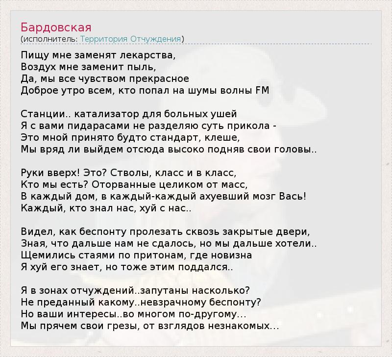 Пищу мне заменят лекарства, Воздух мне заменит пыль, Да, мы все чувством прекрасное Доброе утро всем, кто попал на шумы волны FM Станции.. катализатор для больных ушей Я с вами пидарасами не разделяю суть прикола - Это мной принято будто стандарт, клеше, Мы вряд ли выйдем отсюда высоко подняв свои головы.. Руки вверх! Это? Стволы, класс и в класс, Кто мы есть? Оторванные целиком от масс, В каждый дом, в каждый-каждый ахуевший мозг Вась! Каждый, кто знал нас, хуй с нас.. Видел, как беспонту пролезать сквозь закрытые двери, Зная, что дальше нам не сдалось, но мы дальше хотели.. Щемились стаями по притонам, где новизна Я хуй его знает, но тоже этим поддался.. Я в зонах отчуждений..запутаны насколько? Не преданный какому..невзрачному беспонту? Но ваши интересы..во многом по-другому… Мы прячем свои грезы, от взглядов незнакомых…