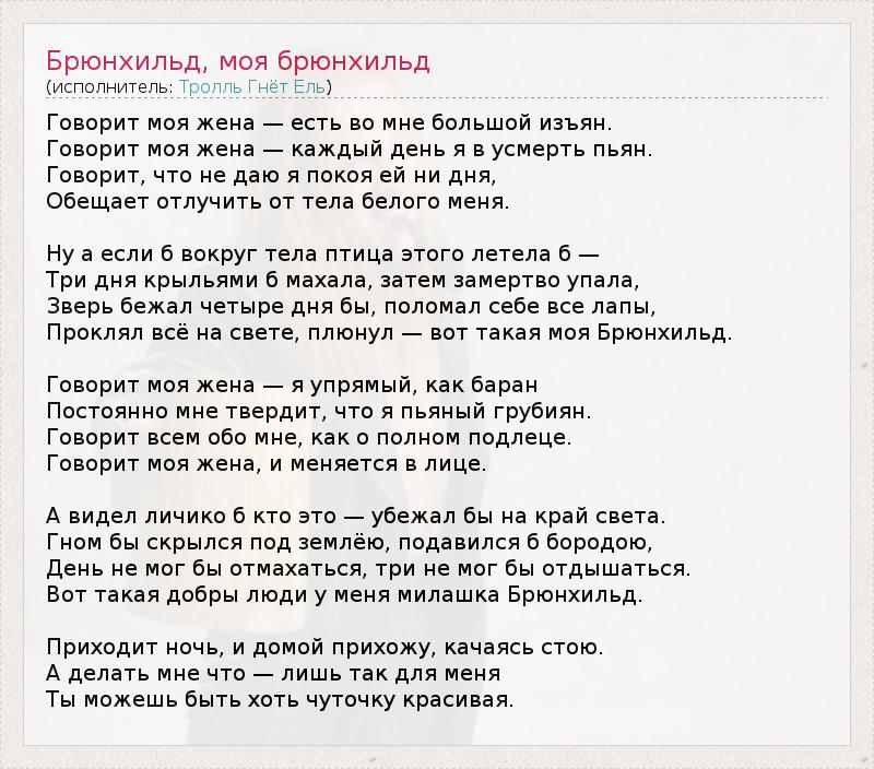 Говорит моя жена — есть во мне большой изъян. Говорит моя жена — каждый день я в усмерть пьян. Говорит, что не даю я покоя ей ни дня, Обещает отлучить от тела белого меня. Ну а если б вокруг тела птица этого летела б — Три дня крыльями б махала, затем замертво упала, Зверь бежал четыре дня бы, поломал себе все лапы, Проклял всё на свете, плюнул — вот такая моя Брюнхильд. Говорит моя жена — я упрямый, как баран Постоянно мне твердит, что я пьяный грубиян. Говорит всем обо мне, как о полном подлеце. Говорит моя жена, и меняется в лице. А видел личико б кто это — убежал бы на край света. Гном бы скрылся под землёю, подавился б бородою, День не мог бы отмахаться, три не мог бы отдышаться. Вот такая добры люди у меня милашка Брюнхильд. Приходит ночь, и домой прихожу, качаясь стою. А делать мне что — лишь так для меня Ты можешь быть хоть чуточку красивая.