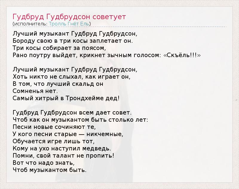 Лучший музыкант Гудбруд Гудбрудсон, Бороду свою в три косы заплетает он. Три косы собирает за поясом, Рано поутру выйдет, крикнет зычным голосом: «Скъёль!!!» Лучший музыкант Гудбруд Гудбрудсон, Хоть никто не слыхал, как играет он, В том, что лучший скальд он Сомненья нет. Самый хитрый в Трондхейме дед! Гудбруд Гудбрудсон всем дает совет. Чтоб как он музыкантом быть столько лет: Песни новые сочиняют те, У кого песни старые — никчемные, Обучается игре лишь тот, Кому на ухо наступил медведь. Помни, свой талант не пропить! Вот что надо знать, Чтоб музыкантом быть.