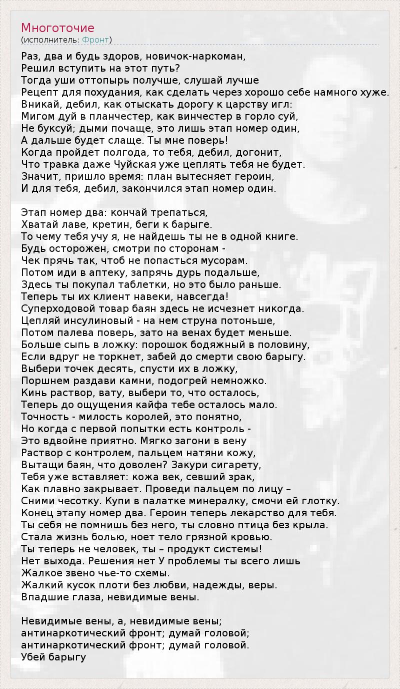 Раз, два и будь здоров, новичок-наркоман, Решил вступить на этот путь? Тогда уши оттопырь получше, слушай лучше Рецепт для похудания, как сделать через хорошо себе намного хуже. Вникай, дебил, как отыскать дорогу к царству игл: Мигом дуй в планчестер, как винчестер в горло суй, Не буксуй; дыми почаще, это лишь этап номер один, А дальше будет слаще. Ты мне поверь! Когда пройдет полгода, то тебя, дебил, догонит, Что травка даже Чуйская уже цеплять тебя не будет. Значит, пришло время: план вытесняет героин, И для тебя, дебил, закончился этап номер один. Этап номер два: кончай трепаться, Хватай лаве, кретин, беги к барыге. То чему тебя учу я, не найдешь ты не в одной книге. Будь осторожен, смотри по сторонам - Чек прячь так, чтоб не попасться мусорам. Потом иди в аптеку, запрячь дурь подальше, Здесь ты покупал таблетки, но это было раньше. Теперь ты их клиент навеки, навсегда! Суперходовой товар баян здесь не исчезнет никогда. Цепляй инсулиновый - на нем струна потоньше, Потом палева поверь, зато на венах будет меньше. Больше сыпь в ложку: порошок бодяжный в половину, Если вдруг не торкнет, забей до смерти свою барыгу. Выбери точек десять, спусти их в ложку, Поршнем раздави камни, подогрей немножко. Кинь раствор, вату, выбери то, что осталось, Теперь до ощущения кайфа тебе осталось мало. Точность - милость королей, это понятно, Но когда с первой попытки есть контроль - Это вдвойне приятно. Мягко загони в вену Раствор с контролем, пальцем натяни кожу, Вытащи баян, что доволен? Закури сигарету, Тебя уже вставляет: кожа век, севший зрак, Как плавно закрывает. Проведи пальцем по лицу – Сними чесотку. Купи в палатке минералку, смочи ей глотку. Конец этапу номер два. Героин теперь лекарство для тебя. Ты себя не помнишь без него, ты словно птица без крыла. Стала жизнь болью, ноет тело грязной кровью. Ты теперь не человек, ты – продукт системы! Нет выхода. Решения нет У проблемы ты всего лишь Жалкое звено чье-то схемы. Жалкий кусок плоти без любви, надежды, веры. Впадшие глаза, невидимые вены. Невидимые вены, а, невидимые вены; антинаркотический фронт; думай головой; антинаркотический фронт; думай головой. Убей барыгу