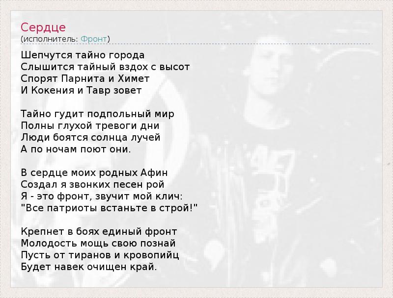Шепчутся тайно города Слышится тайный вздох с высот Спорят Парнита и Химет И Кокения и Тавр зовет Тайно гудит подпольный мир Полны глухой тревоги дни Люди боятся солнца лучей А по ночам поют они. В сердце моих родных Афин Создал я звонких песен рой Я - это фронт, звучит мой клич: "Все патриоты встаньте в строй!" Крепнет в боях единый фронт Молодость мощь свою познай Пусть от тиранов и кровопийц Будет навек очищен край.