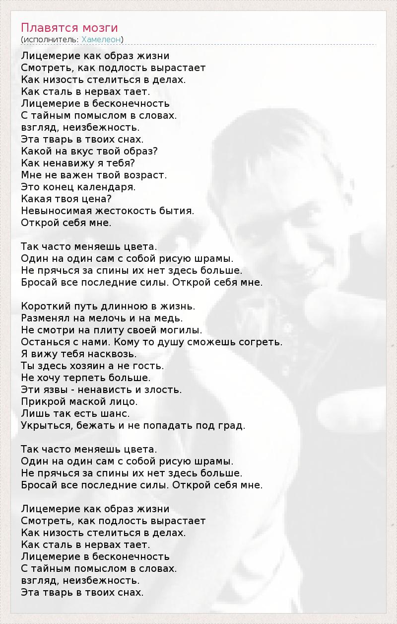Лицемерие как образ жизни Смотреть, как подлость вырастает Как низость стелиться в делах. Как сталь в нервах тает. Лицемерие в бесконечность С тайным помыслом в словах. взгляд, неизбежность. Эта тварь в твоих снах. Какой на вкус твой образ? Как ненавижу я тебя? Мне не важен твой возраст. Это конец календаря. Какая твоя цена? Невыносимая жестокость бытия. Открой себя мне. Так часто меняешь цвета. Один на один сам с собой рисую шрамы. Не прячься за спины их нет здесь больше. Бросай все последние силы. Открой себя мне. Короткий путь длинною в жизнь. Разменял на мелочь и на медь. Не смотри на плиту своей могилы. Останься с нами. Кому то душу сможешь согреть. Я вижу тебя насквозь. Ты здесь хозяин а не гость. Не хочу терпеть больше. Эти язвы - ненависть и злость. Прикрой маской лицо. Лишь так есть шанс. Укрыться, бежать и не попадать под град. Так часто меняешь цвета. Один на один сам с собой рисую шрамы. Не прячься за спины их нет здесь больше. Бросай все последние силы. Открой себя мне. Лицемерие как образ жизни Смотреть, как подлость вырастает Как низость стелиться в делах. Как сталь в нервах тает. Лицемерие в бесконечность С тайным помыслом в словах. взгляд, неизбежность. Эта тварь в твоих снах.