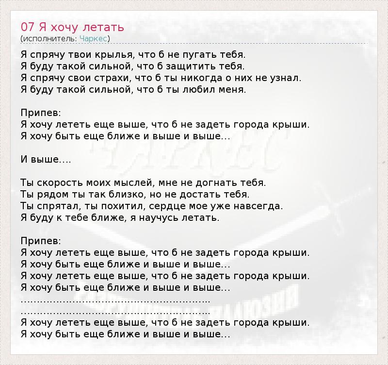 Я спрячу твои крылья, что б не пугать тебя. Я буду такой сильной, что б защитить тебя. Я спрячу свои страхи, что б ты никогда о них не узнал. Я буду такой сильной, что б ты любил меня. Припев: Я хочу лететь еще выше, что б не задеть города крыши. Я хочу быть еще ближе и выше и выше… И выше…. Ты скорость моих мыслей, мне не догнать тебя. Ты рядом ты так близко, но не достать тебя. Ты спрятал, ты похитил, сердце мое уже навсегда. Я буду к тебе ближе, я научусь летать. Припев: Я хочу лететь еще выше, что б не задеть города крыши. Я хочу быть еще ближе и выше и выше… Я хочу лететь еще выше, что б не задеть города крыши. Я хочу быть еще ближе и выше и выше… ………………………………………………….. ………………………………………………….. Я хочу лететь еще выше, что б не задеть города крыши. Я хочу быть еще ближе и выше и выше…