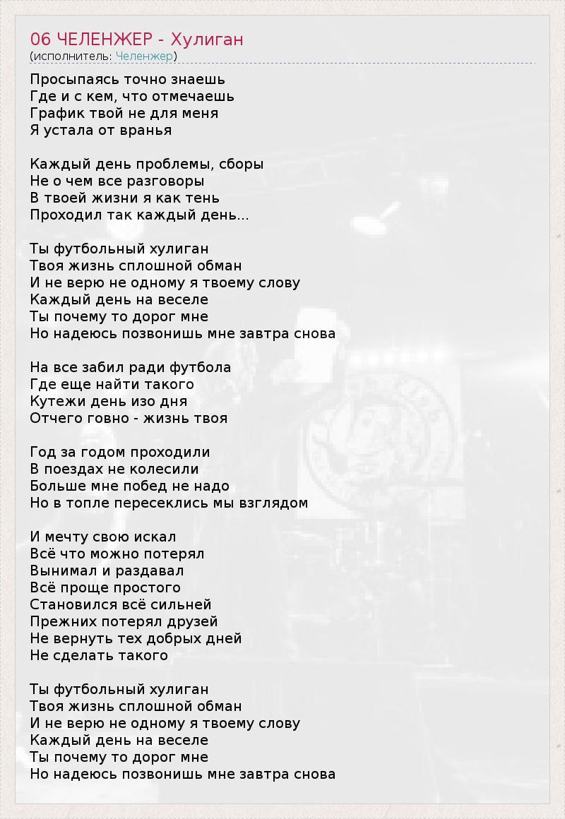 Просыпаясь точно знаешь Где и с кем, что отмечаешь График твой не для меня Я устала от вранья Каждый день проблемы, сборы Не о чем все разговоры В твоей жизни я как тень Проходил так каждый день... Ты футбольный хулиган Твоя жизнь сплошной обман И не верю не одному я твоему слову Каждый день на веселе Ты почему то дорог мне Но надеюсь позвонишь мне завтра снова На все забил ради футбола Где еще найти такого Кутежи день изо дня Отчего говно - жизнь твоя Год за годом проходили В поездах не колесили Больше мне побед не надо Но в топле пересеклись мы взглядом И мечту свою искал Всё что можно потерял Вынимал и раздавал Всё проще простого Становился всё сильней Прежних потерял друзей Не вернуть тех добрых дней Не сделать такого Ты футбольный хулиган Твоя жизнь сплошной обман И не верю не одному я твоему слову Каждый день на веселе Ты почему то дорог мне Но надеюсь позвонишь мне завтра снова