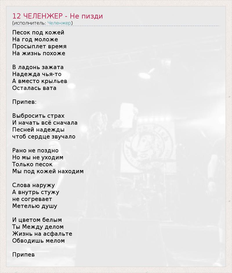 Песок под кожей На год моложе Просыплет время На жизнь похоже В ладонь зажата Надежда чья-то А вместо крыльев Осталась вата Припев: Выбросить страх И начать всё сначала Песней надежды чтоб сердце звучало Рано не поздно Но мы не уходим Только песок Мы под кожей находим Слова наружу А внутрь стужу не согревает Метелью душу И цветом белым Ты Между делом Жизнь на асфальте Обводишь мелом Припев