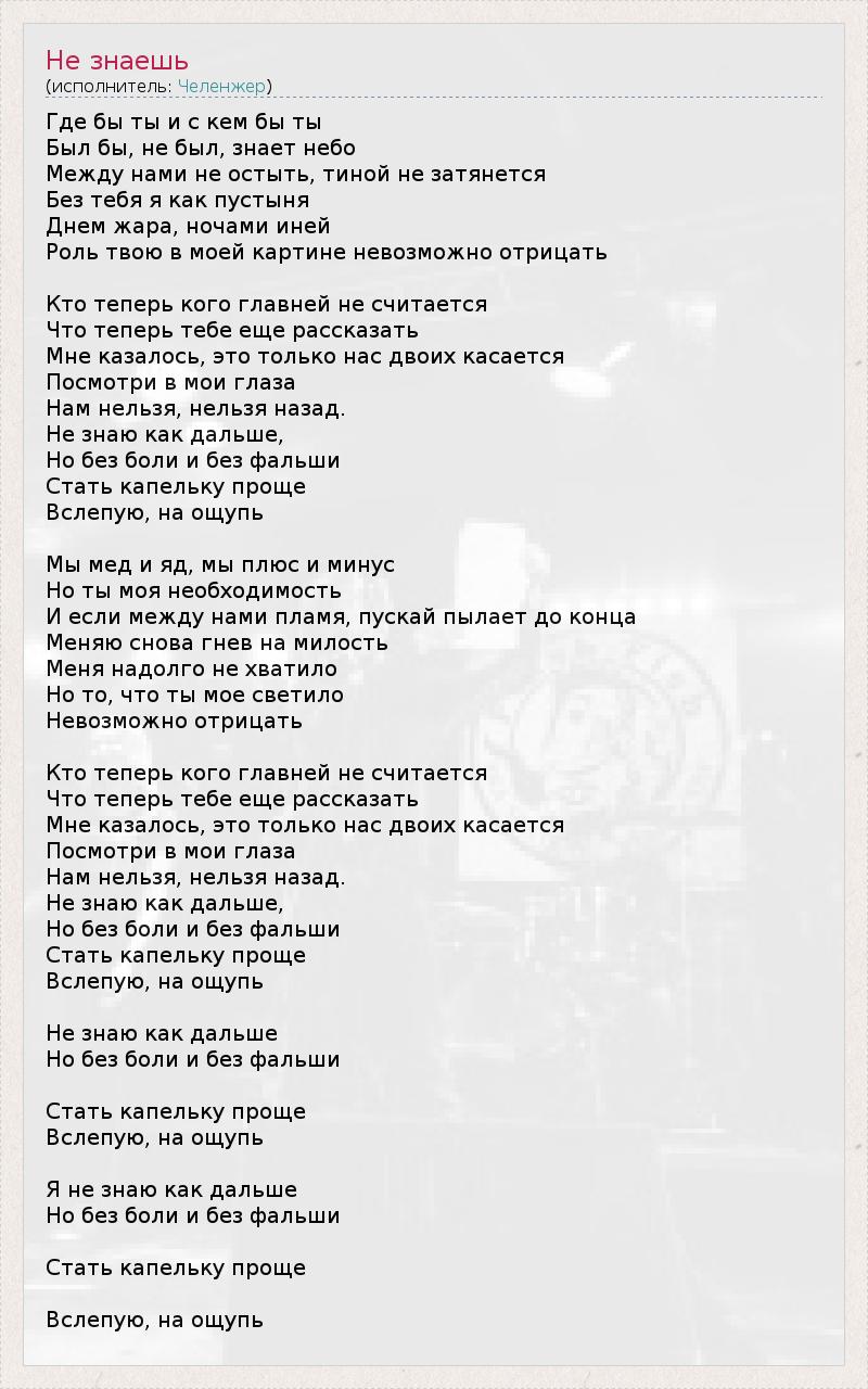 Где бы ты и с кем бы ты Был бы, не был, знает небо Между нами не остыть, тиной не затянется Без тебя я как пустыня Днем жара, ночами иней Роль твою в моей картине невозможно отрицать Кто теперь кого главней не считается Что теперь тебе еще рассказать Мне казалось, это только нас двоих касается Посмотри в мои глаза Нам нельзя, нельзя назад. Не знаю как дальше, Но без боли и без фальши Стать капельку проще Вслепую, на ощупь Мы мед и яд, мы плюс и минус Но ты моя необходимость И если между нами пламя, пускай пылает до конца Меняю снова гнев на милость Меня надолго не хватило Но то, что ты мое светило Невозможно отрицать Кто теперь кого главней не считается Что теперь тебе еще рассказать Мне казалось, это только нас двоих касается Посмотри в мои глаза Нам нельзя, нельзя назад. Не знаю как дальше, Но без боли и без фальши Стать капельку проще Вслепую, на ощупь Не знаю как дальше Но без боли и без фальши Стать капельку проще Вслепую, на ощупь Я не знаю как дальше Но без боли и без фальши Стать капельку проще Вслепую, на ощупь