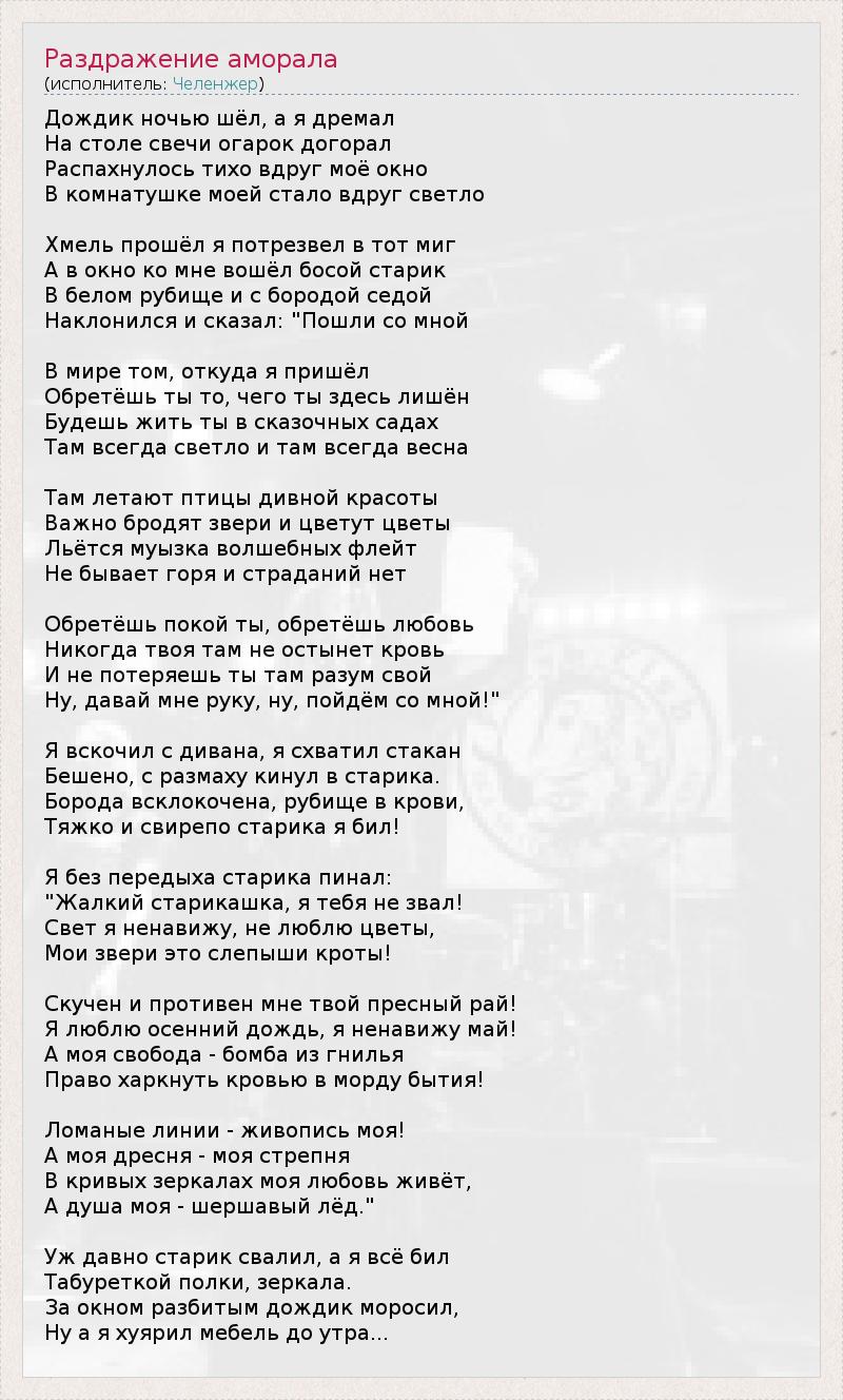 Дождик ночью шёл, а я дремал На столе свечи огарок догорал Распахнулось тихо вдруг моё окно В комнатушке моей стало вдруг светло Хмель прошёл я потрезвел в тот миг А в окно ко мне вошёл босой старик В белом рубище и с бородой седой Наклонился и сказал: "Пошли со мной В мире том, откуда я пришёл Обретёшь ты то, чего ты здесь лишён Будешь жить ты в сказочных садах Там всегда светло и там всегда весна Там летают птицы дивной красоты Важно бродят звери и цветут цветы Льётся муызка волшебных флейт Не бывает горя и страданий нет Обретёшь покой ты, обретёшь любовь Никогда твоя там не остынет кровь И не потеряешь ты там разум свой Ну, давай мне руку, ну, пойдём со мной!" Я вскочил с дивана, я схватил стакан Бешено, с размаху кинул в старика. Борода всклокочена, рубище в крови, Тяжко и свирепо старика я бил! Я без передыха старика пинал: "Жалкий старикашка, я тебя не звал! Свет я ненавижу, не люблю цветы, Мои звери это слепыши кроты! Скучен и противен мне твой пресный рай! Я люблю осенний дождь, я ненавижу май! А моя свобода - бомба из гнилья Право харкнуть кровью в морду бытия! Ломаные линии - живопись моя! А моя дресня - моя стрепня В кривых зеркалах моя любовь живёт, А душа моя - шершавый лёд." Уж давно старик свалил, а я всё бил Табуреткой полки, зеркала. За окном разбитым дождик моросил, Ну а я хуярил мебель до утра...