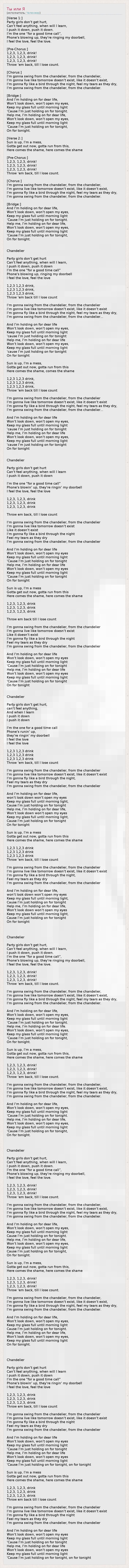 [Verse 1:] Party girls don't get hurt, Can't feel anything, when will I learn, I push it down, push it down. I'm the one “for a good time call”, Phone's blowing up, they're ringing my doorbell, I feel the love, feel the love. [Pre-Chorus:] 1,2,3, 1,2,3, drink! 1,2,3, 1,2,3, drink! 1,2,3, 1,2,3, drink! Throw ‘em back, till I lose count. [Chorus:] I'm gonna swing from the chandelier, from the chandelier, I'm gonna live like tomorrow doesn't exist, like it doesn't exist, I'm gonna fly like a bird through the night, feel my tears as they dry, I'm gonna swing from the chandelier, from the chandelier. [Bridge:] And I'm holding on for dear life, Won't look down, won't open my eyes, Keep my glass full until morning light ‘Cause I'm just holding on for tonight. Help me, I'm holding on for dear life, Won't look down, won't open my eyes, Keep my glass full until morning light ‘Cause I'm just holding on for tonight, On for tonight. [Verse 2:] Sun is up, I'm a mess, Gotta get out now, gotta run from this, Here comes the shame, here comes the shame [Pre-Chorus:] 1,2,3, 1,2,3, drink! 1,2,3, 1,2,3, drink! 1,2,3, 1,2,3, drink! Throw ‘em back, till I lose count. [Chorus:] I'm gonna swing from the chandelier, from the chandelier, I'm gonna live like tomorrow doesn't exist, like it doesn't exist, I'm gonna fly like a bird through the night, feel my tears as they dry, I'm gonna swing from the chandelier, from the chandelier. [Bridge:] And I'm holding on for dear life, Won't look down, won't open my eyes, Keep my glass full until morning light ‘Cause I'm just holding on for tonight. Help me, I'm holding on for dear life, Won't look down, won't open my eyes, Keep my glass full until morning light ‘Cause I'm just holding on for tonight, On for tonight. Chandelier Party girls don't get hurt Can't feel anything, when will I learn, I push it down, push it down I'm the one "for a good time call" Phone's blowing up, ringing my doorbell I feel the love, feel the love 1,2,3 1,2,3 drink, 1,2,3 1,2,3 drink, 1,2,3 1,2,3 drink, Throw 'em back till I lose count I'm gonna swing from the chandelier, from the chandelier I'm gonna live like tomorrow doesn't exist, like it doesn't exist I'm gonna fly like a bird through the night, feel my tears as they dry, I'm gonna swing from the chandelier, from the chandelier... And I'm holding on for dear life Won't look down, won't open my eyes, Keep my glass full until morning light 'cause I'm just holding on for tonight Help me, I'm holding on for dear life Won't look down, won't open my eyes, Keep my glass full until morning light 'cause I'm just holding on for tonight On for tonight Sun is up, I'm a mess, Gotta get out now, gotta run from this Here comes the shame, comes the shame 1,2,3 1,2,3 drink, 1,2,3 1,2,3 drink, 1,2,3 1,2,3 drink, Throw 'em back till I lose count I'm gonna swing from the chandelier, from the chandelier I'm gonna live like tomorrow doesn't exist, like it doesn't exist I'm gonna fly like a bird through the night, feel my tears as they dry, I'm gonna swing from the chandelier, from the chandelier... And I'm holding on for dear life Won't look down, won't open my eyes, Keep my glass full until morning light 'cause I'm just holding on for tonight Help me, I'm holding on for dear life Won't look down, won't open my eyes, Keep my glass full until morning light 'cause I'm just holding on for tonight On for tonight Chandelier Party girls don't get hurt Can't feel anything, when will I learn I push it down, push it down I'm the one "for a good time call" Phone's blowin' up, they're ringin' my doorbell I feel the love, feel the love 1,2,3, 1,2,3, drink 1,2,3, 1,2,3, drink 1,2,3, 1,2,3, drink Throw em back, till I lose count I'm gonna swing from the chandelier, from the chandelier I'm gonna live like tomorrow doesn't exist Like it doesn't exist I'm gonna fly like a bird through the night Feel my tears as they dry I'm gonna swing from the chandelier, from the chandelier And I'm holding on for dear life Won't look down, won't open my eyes Keep my glass full until morning light 'Cause I'm just holding on for tonight Help me, I'm holding on for dear life Won't look down, won't open my eyes Keep my glass full until morning light 'Cause I'm just holding on for tonight On for tonight Sun is up, I'm a mess Gotta get out now, gotta run from this Here comes the shame, here comes the shame 1,2,3, 1,2,3, drink 1,2,3, 1,2,3, drink 1,2,3, 1,2,3, drink Throw em back till I lose count I'm gonna swing from the chandelier, from the chandelier I'm gonna live like tomorrow doesn't exist Like it doesn't exist I'm gonna fly like a bird through the night Feel my tears as they dry I'm gonna swing from the chandelier, from the chandelier And I'm holding on for dear life Won't look down, won't open my eyes Keep my glass full until morning light 'Cause I'm just holding on for tonight Help me, I'm holding on for dear life Won't look down, won't open my eyes Keep my glass full until morning light 'Cause I'm just holding on for tonight On for tonight Chandelier Party girls don't get hurt, can't feel anything, And when I learn I push it down I push it down I'm the one for a good time call Phone's runin' up, they're ringin' my doorbell I feel the love I feel the love 1,2,3 1,2,3 drink 1,2,3 1,2,3 drink 1,2,3 1,2,3 drink Throw 'em back, till I lose count I'm gonna swing from the chandelier, from the chandelier I'm gonna live like tomorrow doesn't exist, like it doesn't exist I'm gonna fly like a bird through the night, Feel my tears as they dry I'm gonna swing from the chandelier, from the chandelier And I'm holding on for dear life, won't look down won't open my eyes Keep my glass full until morning light, Cause I'm just holding on for tonight Help me, I'm holding on for dear life, Won't look down won't open my eyes Keep my glass full until morning light, Cause I'm just holding on for tonight On for tonight Sun is up, I'm a mess Gotta get out now, gotta run from this Here comes the shame, 