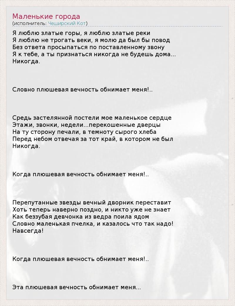 Я люблю златые горы, я люблю златые реки Я люблю не трогать веки, я молю да был бы повод Без ответа просыпаться по поставленному звону Я к тебе, а ты признаться никогда не будешь дома... Никогда. Словно плюшевая вечность обнимает меня!.. Средь застелянной постели мое маленькое сердце Этажи, звонки, недели...перекошенные дверцы На ту сторону печали, в темноту сырого хлеба Перед небом отвечая за тот край, в котором не был Никогда. Когда плюшевая вечность обнимает меня!.. Перепутанные звезды вечный дворник переставит Хоть теперь наверно поздно, и никто уже не знает Как беззубая девчонка из ведра поила ядом Словно маленькая пчелка, и казалось что так надо! Навсегда! Когда плюшевая вечность обнимает меня!.. Эта плюшевая вечность обнимает меня...