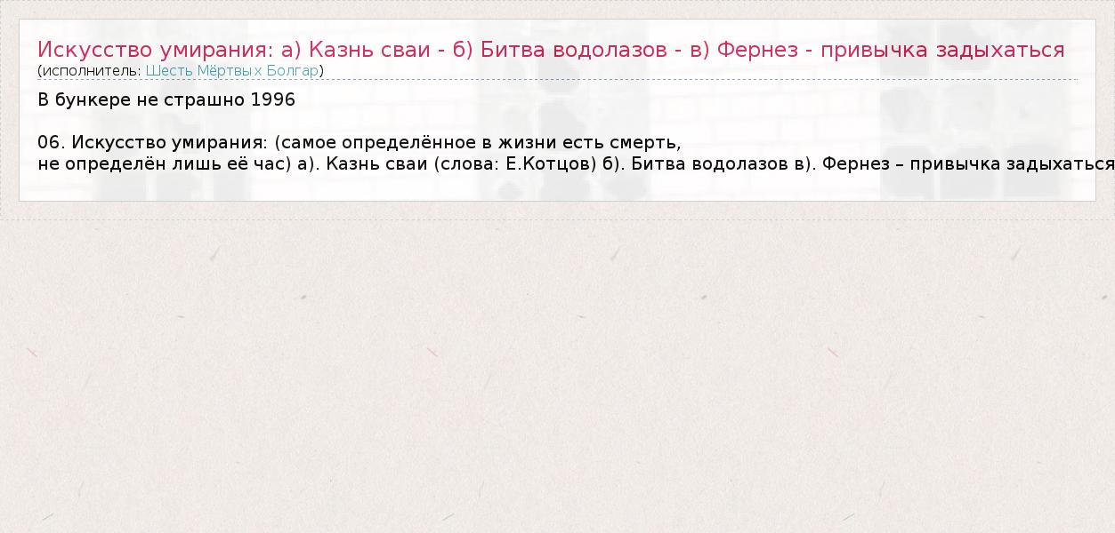 В бункере не страшно 1996 06. Искусство умирания: (самое определённое в жизни есть смерть, не определён лишь её час) а). Казнь сваи (слова: Е.Котцов) б). Битва водолазов в). Фернез – привычка задыхаться