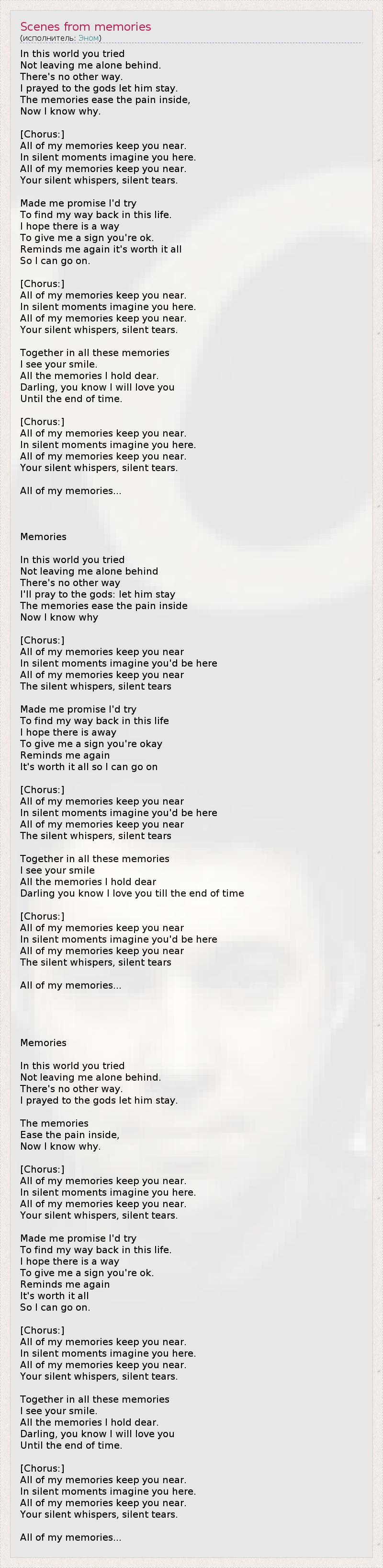 В этом мире ты пытался Не оставить меня одну. Другого пути нет. Я молю всех богов, чтобы они разрешили ему остаться. Воспоминания облегчают эту боль изнутри, И сейчас я знаю, почему. [Припев:] Во всех моих воспоминаниях ты рядом. В тишине я представляю, что ты рядом. Во всех моих воспоминаниях ты рядом. Твой тихий шепот и молчаливые слезы… Он заставил меня пообещать, что я попытаюсь Найти путь обратно в моей жизни. Я надеюсь, что есть путь, Который даст мне знак, что с тобой в порядке. Он напоминает мне, что это стоит всего, И поэтому я могу идти. [Припев:] Во всех моих воспоминаниях ты рядом. В тишине я представляю, что ты рядом. Во всех моих воспоминаниях ты рядом. Твой тихий шепот и молчаливые слезы… В моих воспоминаниях Я вижу твою улыбку. Все эти воспоминания так дороги для меня. Дорогой, ты знаешь, я буду любить тебя До конца времен… [Припев:] Во всех моих воспоминаниях ты рядом. В тишине я представляю, что ты рядом. Во всех моих воспоминаниях ты рядом. Твой тихий шепот и молчаливые слезы… Во всех моих воспоминаниях... Воспоминания* (перевод Ильдар из Сыктывкара) Ты хотел всегда, Чтоб не осталась я одна. Путь один лишь есть — Молюсь, чтоб остался он здесь. Воспоминанья боль уймут. И вот почему: [Припев:] Все воспоминания — с тобой. Представлю я словно ты рядом со мной. Во всех воспоминаниях души Беззвучный шёпот, слёзы в тиши. Заставил пообещать Найти к жизни путь опять. Верю: ты найдёшь как, Что всё хорошо, дать мне знак. Напомнишь, что есть всему цена, Я жить дальше должна. [Припев:] Все воспоминания — с тобой. Представлю я словно ты рядом со мной. Во всех воспоминаниях души Беззвучный шёпот, слёзы в тиши. Во всех воспоминаниях вдвоём. Улыбку вижу я твою. Память эту бережно храню. Знай, что любить я буду до конца времён. [Припев:] Все воспоминания — с тобой. Представлю я словно ты рядом со мной. Во всех воспоминаниях души Беззвучный шёпот, слёзы в тиши. Все воспоминания... * поэтический (эквиритмичный) перевод Воспоминания (перевод Anastasiya) В этом мире ты пытался Не оставить меня одну, Но мой путь с твоим расстался... Я скрестить их Богов молю... Лишь воспоминаний тень Мне облегчит эту боль, что пронзает меня изнутри, Не уходи... постой... [Припев:] Во всех моих воспоминаниях ты рядом, В молчании я представляю, что ты здесь. Во всех моих воспоминаниях ты рядом, Твой взгляд, твой голос, слезы, что ни счесть. Ты заставил меня обещать, Что я буду пытаться жить дальше... Я надеюсь на неба знак, Что мне скажет - с тобой все в порядке. Он напомнит, что надо жить, он напомнит моё обещанье. Я поднимусь и схвачу ту «нить», Я сохраню хрупкое воспоминание. [Припев:] Во всех моих воспоминаниях ты рядом, В молчании я представляю, что ты здесь. Во всех моих воспоминаниях ты рядом, Твой взгляд, твой голос, слезы, что ни счесть. В моих воспоминаниях Ты улыбнешься только для меня. Я буду до скончания Всегда... везде... Любить тебя... [Припев:] Во всех моих воспоминаниях ты рядом, В молчании я представляю, что ты здесь. Во всех моих воспоминаниях ты рядом, Твой взгляд, твой голос, слезы, что ни счесть. Во всех моих воспоминаниях...