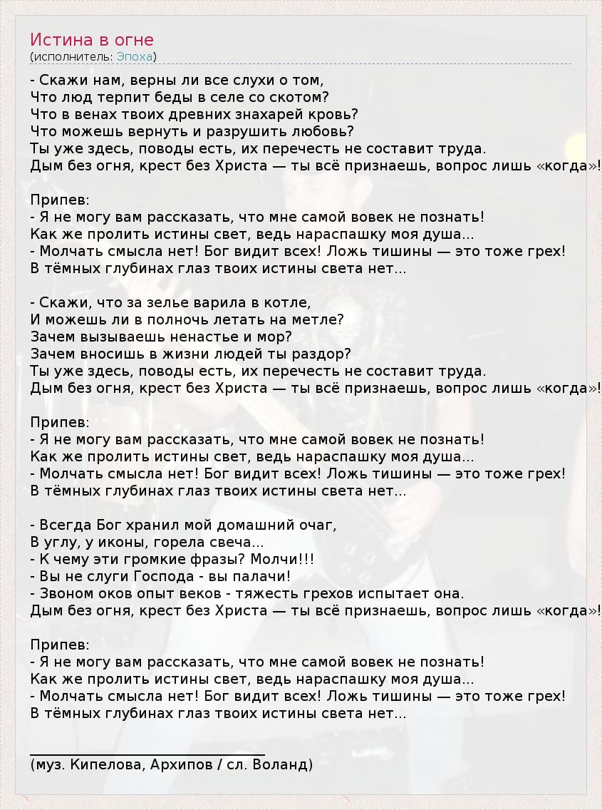 - Скажи нам, верны ли все слухи о том, Что люд терпит беды в селе со скотом? Что в венах твоих древних знахарей кровь? Что можешь вернуть и разрушить любовь? Ты уже здесь, поводы есть, их перечесть не составит труда. Дым без огня, крест без Христа — ты всё признаешь, вопрос лишь «когда»! Припев: - Я не могу вам рассказать, что мне самой вовек не познать! Как же пролить истины свет, ведь нараспашку моя душа... - Молчать смысла нет! Бог видит всех! Ложь тишины — это тоже грех! В тёмных глубинах глаз твоих истины света нет... - Скажи, что за зелье варила в котле, И можешь ли в полночь летать на метле? Зачем вызываешь ненастье и мор? Зачем вносишь в жизни людей ты раздор? Ты уже здесь, поводы есть, их перечесть не составит труда. Дым без огня, крест без Христа — ты всё признаешь, вопрос лишь «когда»! Припев: - Я не могу вам рассказать, что мне самой вовек не познать! Как же пролить истины свет, ведь нараспашку моя душа... - Молчать смысла нет! Бог видит всех! Ложь тишины — это тоже грех! В тёмных глубинах глаз твоих истины света нет... - Всегда Бог хранил мой домашний очаг, В углу, у иконы, горела свеча... - К чему эти громкие фразы? Молчи!!! - Вы не слуги Господа - вы палачи! - Звоном оков опыт веков - тяжесть грехов испытает она. Дым без огня, крест без Христа — ты всё признаешь, вопрос лишь «когда»! Припев: - Я не могу вам рассказать, что мне самой вовек не познать! Как же пролить истины свет, ведь нараспашку моя душа... - Молчать смысла нет! Бог видит всех! Ложь тишины — это тоже грех! В тёмных глубинах глаз твоих истины света нет... _________________________________ (муз. Кипелова, Архипов / сл. Воланд)