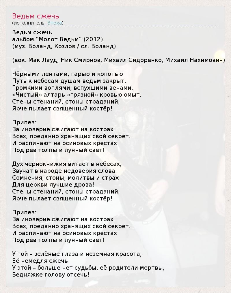 Ведьм сжечь альбом "Молот Ведьм" (2012) (муз. Воланд, Козлов / сл. Воланд) (вок. Мак Лауд, Ник Смирнов, Михаил Сидоренко, Михаил Нахимович) Чёрными лентами, гарью и копотью Путь к небесам душам ведьм закрыт, Громкими воплями, вспухшими венами, «Чистый» алтарь «грязной» кровью омыт. Стены стенаний, стоны страданий, Ярче пылает священный костёр! Припев: За иноверие сжигают на кострах Всех, преданно хранящих свой секрет. И распинают на осиновых крестах Под рёв толпы и лунный свет! Дух чернокнижия витает в небесах, Звучат в народе недоверия слова. Сомнения, стоны, молитвы и страх Для церкви лучшие дрова! Стены стенаний, стоны страданий, Ярче пылает священный костёр! Припев: За иноверие сжигают на кострах Всех, преданно хранящих свой секрет. И распинают на осиновых крестах Под рёв толпы и лунный свет! У той – зелёные глаза и неземная красота, Её немедля сжечь! У этой – больше нет судьбы, её родители мертвы, Бедняжке голову отсечь!