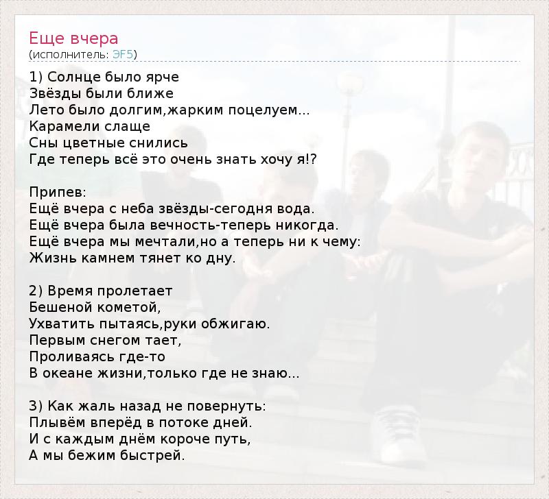 1) Солнце было ярче Звёзды были ближе Лето было долгим,жарким поцелуем... Карамели слаще Сны цветные снились Где теперь всё это очень знать хочу я!? Припев: Ещё вчера с неба звёзды-сегодня вода. Ещё вчера была вечность-теперь никогда. Ещё вчера мы мечтали,но а теперь ни к чему: Жизнь камнем тянет ко дну. 2) Время пролетает Бешеной кометой, Ухватить пытаясь,руки обжигаю. Первым снегом тает, Проливаясь где-то В океане жизни,только где не знаю... 3) Как жаль назад не повернуть: Плывём вперёд в потоке дней. И с каждым днём короче путь, А мы бежим быстрей.