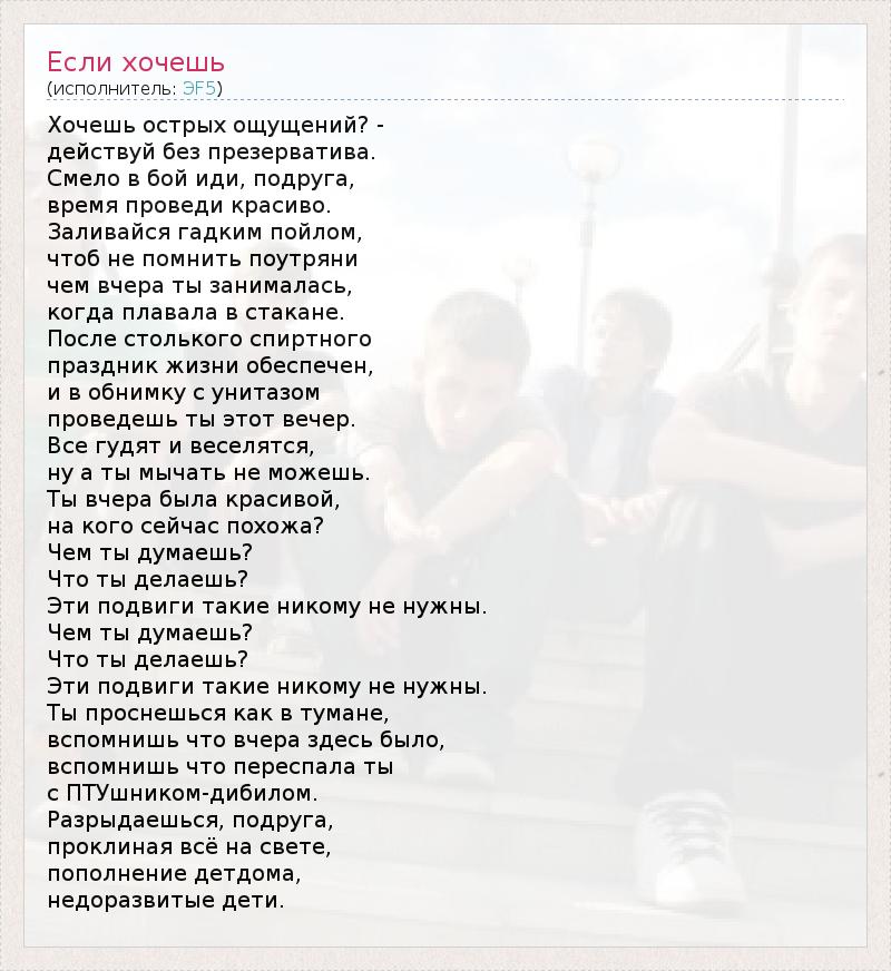 Хочешь острых ощущений? - действуй без презерватива. Смело в бой иди, подруга, время проведи красиво. Заливайся гадким пойлом, чтоб не помнить поутряни чем вчера ты занималась, когда плавала в стакане. После столького спиртного праздник жизни обеспечен, и в обнимку с унитазом проведешь ты этот вечер. Все гудят и веселятся, ну а ты мычать не можешь. Ты вчера была красивой, на кого сейчас похожа? Чем ты думаешь? Что ты делаешь? Эти подвиги такие никому не нужны. Чем ты думаешь? Что ты делаешь? Эти подвиги такие никому не нужны. Ты проснешься как в тумане, вспомнишь что вчера здесь было, вспомнишь что переспала ты с ПТУшником-дибилом. Разрыдаешься, подруга, проклиная всё на свете, пополнение детдома, недоразвитые дети.