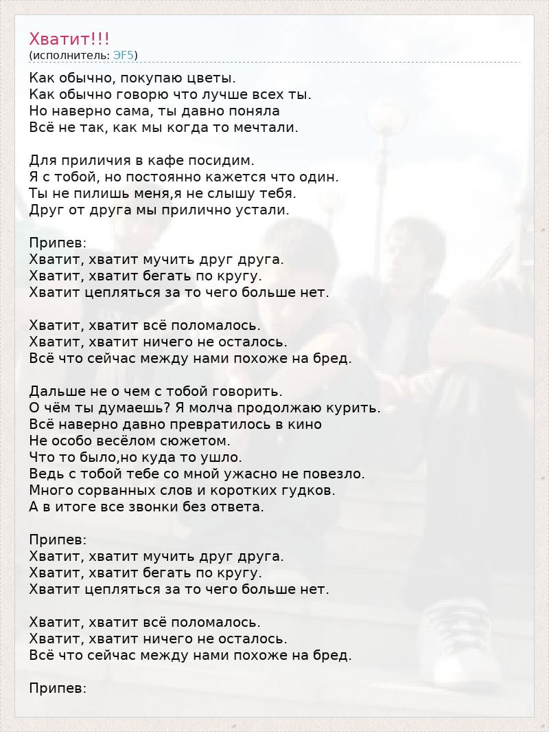 Как обычно, покупаю цветы. Как обычно говорю что лучше всех ты. Но наверно сама, ты давно поняла Всё не так, как мы когда то мечтали. Для приличия в кафе посидим. Я с тобой, но постоянно кажется что один. Ты не пилишь меня,я не слышу тебя. Друг от друга мы прилично устали. Припев: Хватит, хватит мучить друг друга. Хватит, хватит бегать по кругу. Хватит цепляться за то чего больше нет. Хватит, хватит всё поломалось. Хватит, хватит ничего не осталось. Всё что сейчас между нами похоже на бред. Дальше не о чем с тобой говорить. О чём ты думаешь? Я молча продолжаю курить. Всё наверно давно превратилось в кино Не особо весёлом сюжетом. Что то было,но куда то ушло. Ведь с тобой тебе со мной ужасно не повезло. Много сорванных слов и коротких гудков. А в итоге все звонки без ответа. Припев: Хватит, хватит мучить друг друга. Хватит, хватит бегать по кругу. Хватит цепляться за то чего больше нет. Хватит, хватит всё поломалось. Хватит, хватит ничего не осталось. Всё что сейчас между нами похоже на бред. Припев: