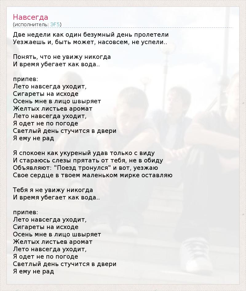 Две недели как один безумный день пролетели Уезжаешь и, быть может, насовсем, не успели.. Понять, что не увижу никогда И время убегает как вода.. припев: Лето навсегда уходит, Сигареты на исходе Осень мне в лицо швыряет Желтых листьев аромат Лето навсегда уходит, Я одет не по погоде Светлый день стучится в двери Я ему не рад Я спокоен как укуреный удав только с виду И стараюсь слезы прятать от тебя, не в обиду Объявляют: "Поезд тронулся" и вот, уезжаю Свое сердце в твоем маленьком мирке оставляю Тебя я не увижу никогда И время убегает как вода.. припев: Лето навсегда уходит, Сигареты на исходе Осень мне в лицо швыряет Желтых листьев аромат Лето навсегда уходит, Я одет не по погоде Светлый день стучится в двери Я ему не рад