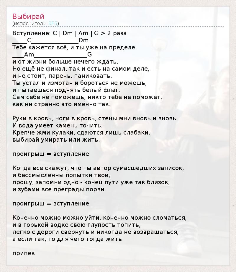 Вступление: С | Dm | Am | G > 2 раза _____C________________Dm Тебе кажется всё, и ты уже на пределе ____Am__________________G и от жизни больше нечего ждать. Но ещё не финал, так и есть на самом деле, и не стоит, парень, паниковать. Ты устал и измотан и бороться не можешь, и пытаешься поднять белый флаг. Сам себе не поможешь, никто тебе не поможет, как ни странно это именно так. Руки в кровь, ноги в кровь, стены мни вновь и вновь. И вода умеет камень точить. Крепче жми кулаки, сдаются лишь слабаки, выбирай умирать или жить. проигрыш = вступление Когда все скажут, что ты автор сумасшедших записок, и бессмысленны попытки твои, прошу, запомни одно - конец пути уже так близок, и зубами все преграды порви. проигрыш = вступление Конечно можно можно уйти, конечно можно сломаться, и в горькой водке свою глупость топить, легко с дороги свернуть и никогда не возвращаться, а если так, то для чего тогда жить припев