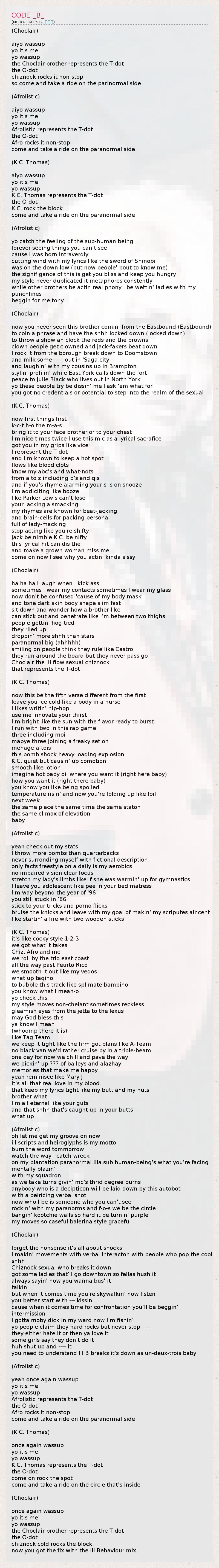 (Choclair) aiyo wassup yo it's me yo wassup the Choclair brother represents the T-dot the O-dot chiznock rocks it non-stop so come and take a ride on the parinormal side (Afrolistic) aiyo wassup yo it's me yo wassup Afrolistic represents the T-dot the O-dot Afro rocks it non-stop come and take a ride on the paranormal side (K.C. Thomas) aiyo wassup yo it's me yo wassup K.C. Thomas represents the T-dot the O-dot K.C. rock the block come and take a ride on the paranormal side (Afrolistic) yo catch the feeling of the sub-human being forever seeing things you can't see cause I was born intraverdly cutting wind with my lyrics like the sword of Shinobi was on the down low (but now people' bout to know me) the signifigance of this is get you bliss and keep you hungry my style never duplicated it metaphores constently while other brothers be actin real phony I be wettin' ladies with my punchlines beggin for me tony (Choclair) now you never seen this brother comin' from the Eastbound (Eastbound) to coin a phrase and have the shhh locked down (locked down) to throw a show an clock the reds and the browns clown people get clowned and jack-fakers beat down I rock it from the borough break down to Doomstown and milk some ----- out in 'Saga city and laughin' with my cousins up in Brampton stylin' profilin' while East York calls down the fort peace to Julie Black who lives out in North York yo these people try be dissin' me I ask 'em what for you got no credentials or potential to step into the realm of the sexual (K.C. Thomas) now first things first k-c-t h-o the m-a-s bring it to your face brother or to your chest I'm nice times twice I use this mic as a lyrical sacrafice got you in my grips like vice I represent the T-dot and I'm known to keep a hot spot flows like blood clots know my abc's and what-nots from a to z including p's and q's and if you's rhyme alarming your's is on snooze I'm addiciting like booze like Parker Lewis can't lose your lacking a smacking my rhymes are known for beat-jacking and brain-cells for packing persona full of lady-macking stop acting like you're shifty Jack be nimble K.C. be nifty this lyrical hit can dis the and make a grown woman miss me come on now I see why you actin' kinda sissy (Choclair) ha ha ha I laugh when I kick ass sometimes I wear my contacts sometimes I wear my glass now don't be confused 'cause of my body mask and tone dark skin body shape slim fast sit down and wonder how a brother like I can stick out and penetrate like I'm between two thighs people gettin' hog-tied they riled up droppin' more shhh than stars paranormal big (ahhhhh) smiling on people think they rule like Castro they run around the board but they never pass go Choclair the ill flow sexual chiznock that represents the T-dot (K.C. Thomas) now this be the fifth verse different from the first leave you ice cold like a body in a hurse I likes writin' hip-hop use me innovate your thirst I'm bright like the sun with the flavor ready to burst I run with two in this rap game three including moi mabye three joining a freaky setion menage-a-tois this bomb shock heavy loading explosion K.C. quiet but causin' up comotion smooth like lotion imagine hot baby oil where you want it (right here baby) how you want it (right there baby) you know you like being spoiled temperature risin' and now you're folding up like foil next week the same place the same time the same staton the same climax of elevation baby (Afrolistic) yeah check out my stats I throw more bombs than quarterbacks never surronding myself with fictional description only facts freestyle on a daily is my aerobics no impaired vision clear focus stretch my lady's limbs like if she was warmin' up for gymnastics I leave you adolescent like pee in your bed matress I'm way beyond the year of '96 you still stuck in '86 stick to your tricks and porno flicks bruise the knicks and leave with my goal of makin' my scriputes aincent like startin' a fire with two wooden sticks (K.C. Thomas) it's like cocky style 1-2-3 we got what it takes Chiz, Afro and me we roll by the trio east coast all the way past Peurto Rico we smooth it out like my vedos what up taqino to bubble this track like splimate bambino you know what I mean-o yo check this my style moves non-chelant sometimes reckless gleamish eyes from the jetta to the lexus may God bless this ya know I mean (whoomp there it is) like Tag Team we keep it tight like the firm got plans like A-Team no black van we'd rather cruise by in a triple-beam one day for now we chill and pave the way we pickin' up ??? of baileys and alazhay memories that make me happy yeah reminisce like Mary J it's all that real love in my blood that keep my lyrics tight like my butt and my nuts brother what I'm all eternal like your guts and that shhh that's caught up in your butts what up (Afrolistic) oh let me get my groove on now ill scripts and heiroglyphs is my motto burn the word tommorrow watch the way I catch wreck on my plantation paranormal illa sub human-being's what you're facing mentally blazin' with my squadron as we take turns givin' mc's thrid degree burns anybody who is a decipticon will be laid down by this autobot with a peiricing verbal shot now who I be is someone who you can't see rockin' with my paranorms and f-o-s we be the circle bangin' kootchie walls so hard it be turnin' purple my moves so caseful balerina style graceful (Choclair) forget the nonsense it's all about shocks I makin' movements with verbal interacton with people who pop the cool shhh Chiznock sexual who breaks it down got some ladies that'll go downtown so fellas hush it always sayin' how you wanna bus' it talkin' but when it comes time you're skywalkin' now listen you better start with --- kissin' cause when it comes time for confrontation you'll be beggin' intermission I gotta moby dick in my ward now I'm fishin' yo people claim they hard rocks but never stop ------ they either hate it or then ya love it some girls say they don't do it hu