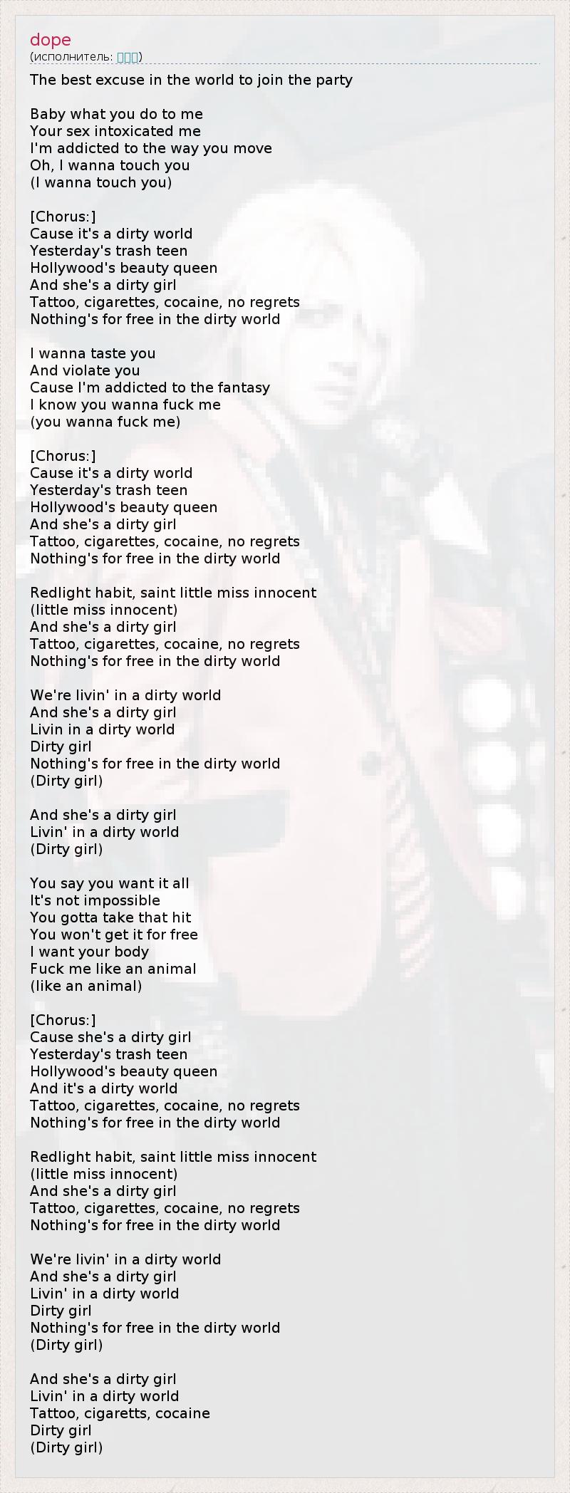 The best excuse in the world to join the party Baby what you do to me Your sex intoxicated me I'm addicted to the way you move Oh, I wanna touch you (I wanna touch you) [Chorus:] Cause it's a dirty world Yesterday's trash teen Hollywood's beauty queen And she's a dirty girl Tattoo, cigarettes, cocaine, no regrets Nothing's for free in the dirty world I wanna taste you And violate you Cause I'm addicted to the fantasy I know you wanna fuck me (you wanna fuck me) [Chorus:] Cause it's a dirty world Yesterday's trash teen Hollywood's beauty queen And she's a dirty girl Tattoo, cigarettes, cocaine, no regrets Nothing's for free in the dirty world Redlight habit, saint little miss innocent (little miss innocent) And she's a dirty girl Tattoo, cigarettes, cocaine, no regrets Nothing's for free in the dirty world We're livin' in a dirty world And she's a dirty girl Livin in a dirty world Dirty girl Nothing's for free in the dirty world (Dirty girl) And she's a dirty girl Livin' in a dirty world (Dirty girl) You say you want it all It's not impossible You gotta take that hit You won't get it for free I want your body Fuck me like an animal (like an animal) [Chorus:] Cause she's a dirty girl Yesterday's trash teen Hollywood's beauty queen And it's a dirty world Tattoo, cigarettes, cocaine, no regrets Nothing's for free in the dirty world Redlight habit, saint little miss innocent (little miss innocent) And she's a dirty girl Tattoo, cigarettes, cocaine, no regrets Nothing's for free in the dirty world We're livin' in a dirty world And she's a dirty girl Livin' in a dirty world Dirty girl Nothing's for free in the dirty world (Dirty girl) And she's a dirty girl Livin' in a dirty world Tattoo, cigaretts, cocaine Dirty girl (Dirty girl)