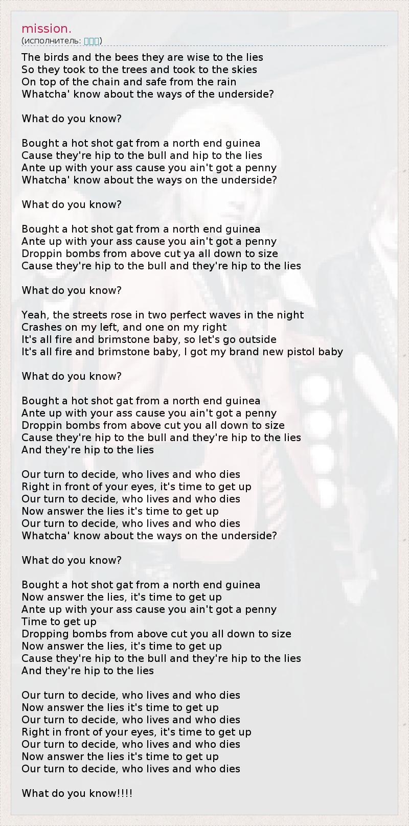Миссия / Операция Что ты знаешь? Птицы и пчелы знают про ложь По деревьям порхают и в небе летают Сидят на вершинах, где не капает дождь Что вы знаете о том, как на дне обитают? Что ты знаешь? Купил скорострельную пушку в "северной Гвинеи"* Что есть враки, что ложь – им сверху видней Расплатись своей шкурой, ведь у тебя нет ни пенни Что вы знаете о том, что происходит на дне? Что ты знаешь? Купил у итальяшки скорострельную пушку Расплатись своей шкурой, ведь у тебя нет ни пенни Бомбы вас место поставят, упав на макушки Ведь, что враки, что ложь – им сверху виднее Что ты знаешь? Город по ночам, словно море, волнуется* Грохот слева и справа, тут и там заварушка Кругом ад, детка, так выйдем на улицы* Кругом ад, детка, но у меня есть новая пушка Что ты знаешь? Купил у итальяшки скорострельную пушку Расплатись своей шкурой, ведь у тебя нет ни пенни Бомбы вас на место поставят, упав на макушки Ведь что враки, что ложь – им сверху виднее Теперь мы будем решать, кому жить, а кому умирать Прямо на ваших глазах, пришло время вставать Теперь мы будем решать, кому жить, а кому умирать Теперь мы знаем о лжи, время вставать Теперь мы будем решать, кому жить, а кому умирать Что вы знаете о том, что происходит на дне? Что ты знаешь? Купил у итальяшки скорострельную пушку (Теперь мы знаем о лжи, и время вставать) Расплатись своей шкурой, ведь у тебя нет ни пенни (Время подниматься) Бомбы вас на место поставят, упав на макушки (Теперь мы знаем о лжи, время вставать) Ведь, что враки, что ложь – им сверху виднее