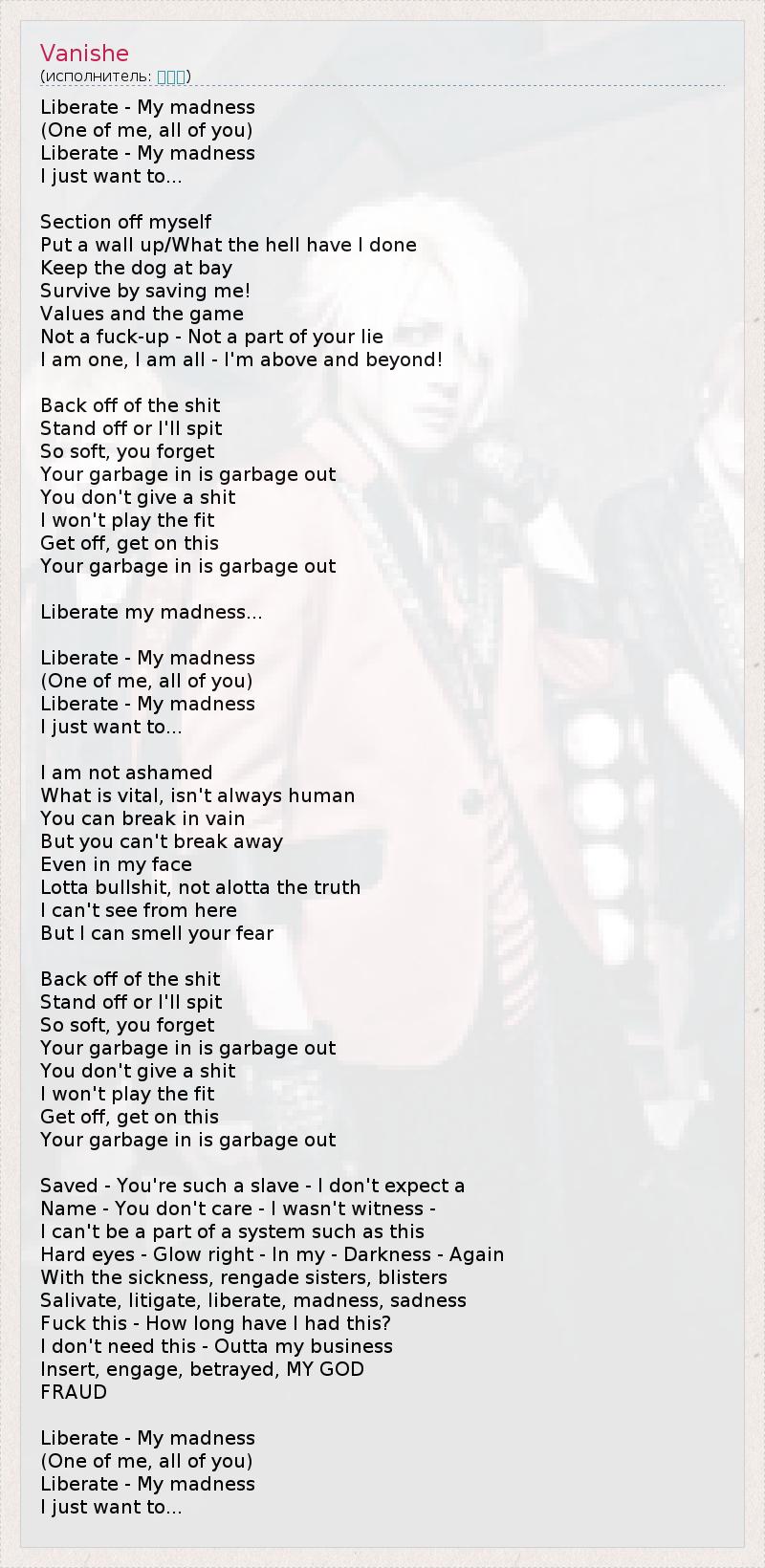 Liberate - My madness (One of me, all of you) Liberate - My madness I just want to... Section off myself Put a wall up/What the hell have I done Keep the dog at bay Survive by saving me! Values and the game Not a fuck-up - Not a part of your lie I am one, I am all - I'm above and beyond! Back off of the shit Stand off or I'll spit So soft, you forget Your garbage in is garbage out You don't give a shit I won't play the fit Get off, get on this Your garbage in is garbage out Liberate my madness... Liberate - My madness (One of me, all of you) Liberate - My madness I just want to... I am not ashamed What is vital, isn't always human You can break in vain But you can't break away Even in my face Lotta bullshit, not alotta the truth I can't see from here But I can smell your fear Back off of the shit Stand off or I'll spit So soft, you forget Your garbage in is garbage out You don't give a shit I won't play the fit Get off, get on this Your garbage in is garbage out Saved - You're such a slave - I don't expect a Name - You don't care - I wasn't witness - I can't be a part of a system such as this Hard eyes - Glow right - In my - Darkness - Again With the sickness, rengade sisters, blisters Salivate, litigate, liberate, madness, sadness Fuck this - How long have I had this? I don't need this - Outta my business Insert, engage, betrayed, MY GOD FRAUD Liberate - My madness (One of me, all of you) Liberate - My madness I just want to...