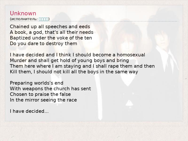 Chained up all speeches and eeds A book, a god, that's all their needs Baptized under the voke of the ten Do you dare to destroy them I have decided and I think I should become a homosexual Murder and shall get hold of young boys and bring Them here where I am staying and I shall rape them and then Kill them, I should not kill all the boys in the same way Preparing worlds's end With weapons the church has sent Chosen to praise the false In the mirror seeing the race I have decided...