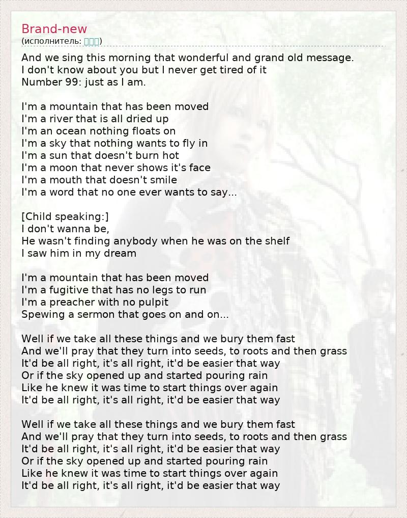 Этим утром мы поем удивительную и грандиозную, старую проповедь. Не знаю, как вы, а я никогда от этого не устану. Номер 99: прямо как я. Я гора, которую сдвинули с места, Я высушенная до дна река. Я мертвый океан, на поверхности которого ничто не плавает, Я небо, по которому никто не хочет летать. Я солнце, которое не греет, Я луна, которая никогда не показывается, Я рот, который никогда не улыбается, Я слово, которое никто никогда не захочет произнести... [Голос ребенка] Я не хочу быть, Он был никому не нужен, когда он был не у дел, Я видел его во сне. Я гора, которую сдвинули с места, Я беглец, у которого нет ног, чтобы убежать, Я проповедник без кафедры, Извергающий бесконечную проповедь... А что, если мы возьмем и все это быстро закопаем, А затем помолимся, чтобы семя пустило корни и ростки? Все будет хорошо, все хорошо, так будет легче... Или если бы небо разверзлось и начался дождь, Будто бы он знал, что пришло время все начать сначала? Все будет хорошо, все хорошо, так будет легче... А что, если мы возьмем и все это быстро закопаем, А затем помолимся, чтобы семя пустило корни и ростки? Все будет хорошо, все хорошо, так будет легче... Или если бы небо разверзлось и начался дождь, Будто бы он знал, что пришло время все начать сначала? Все будет хорошо, все хорошо, так будет легче...