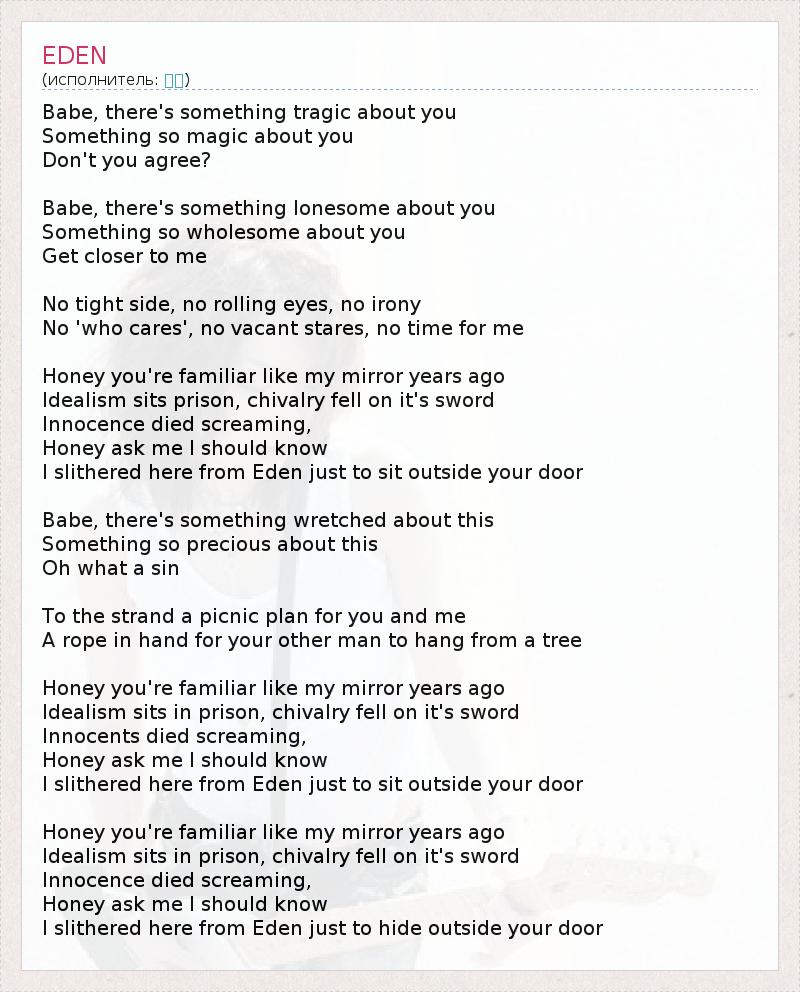 Детка, в тебе есть что-то печальное В тебе есть что-то волшебное Ты не согласна? Детка, в тебе есть одиночество В тебе есть яркая жизнь Подойди ко мне поближе Нет прочных стен, нет насмешливых взглядов и иронии Нет тех "кому не наплевать", нет выхода, нет времени для меня Милая ты родная мне, как моё отражение в зеркале много лет назад Идеалы заперты в тюрьме, за пораженное мечом рыцарство Невинность погибает с пронзительным криком, Милая, спроси меня, я знаю ответ Я приполз сюда из Эдема, чтобы ждать тебя у дверей Детка, есть в этом что-то несчастное И одновременно драгоценное Какой же это грех Я планирую устроить пикник для нас двоих А твой мужчина уже держит веревку, чтобы закинуть петлю на дерево Милая ты родная мне, как моё отражение в зеркале много лет назад Идеалы заперты в тюрьме, за пораженное мечом рыцарство Невинность погибает с пронзительным криком, Милая, спроси меня, я знаю ответ Я приполз сюда из Эдема, чтобы ждать тебя у дверей Милая ты родная мне, как моё отражение в зеркале много лет назад Идеалы заперты в тюрьме, за пораженное мечом рыцарство Невинность погибает с пронзительным криком, Милая, спроси меня, я знаю ответ Я приполз сюда из Эдема, чтобы ждать тебя у дверей