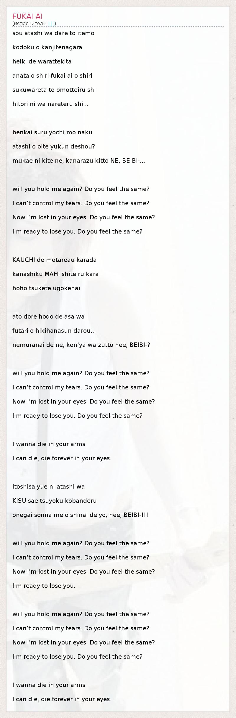sou atashi wa dare to itemo kodoku o kanjitenagara heiki de warattekita anata o shiri fukai ai o shiri sukuwareta to omotteiru shi hitori ni wa nareteru shi... benkai suru yochi mo naku atashi o oite yukun deshou? mukae ni kite ne, kanarazu kitto NE, BEIBI-... will you hold me again? Do you feel the same? I can't control my tears. Do you feel the same? Now I'm lost in your eyes. Do you feel the same? I'm ready to lose you. Do you feel the same? KAUCHI de motareau karada kanashiku MAHI shiteiru kara hoho tsukete ugokenai ato dore hodo de asa wa futari o hikihanasun darou... nemuranai de ne, kon'ya wa zutto nee, BEIBI-? will you hold me again? Do you feel the same? I can't control my tears. Do you feel the same? Now I'm lost in your eyes. Do you feel the same? I'm ready to lose you. Do you feel the same? I wanna die in your arms I can die, die forever in your eyes itoshisa yue ni atashi wa KISU sae tsuyoku kobanderu onegai sonna me o shinai de yo, nee, BEIBI-!!! will you hold me again? Do you feel the same? I can't control my tears. Do you feel the same? Now I'm lost in your eyes. Do you feel the same? I'm ready to lose you. will you hold me again? Do you feel the same? I can't control my tears. Do you feel the same? Now I'm lost in your eyes. Do you feel the same? I'm ready to lose you. Do you feel the same? I wanna die in your arms I can die, die forever in your eyes
