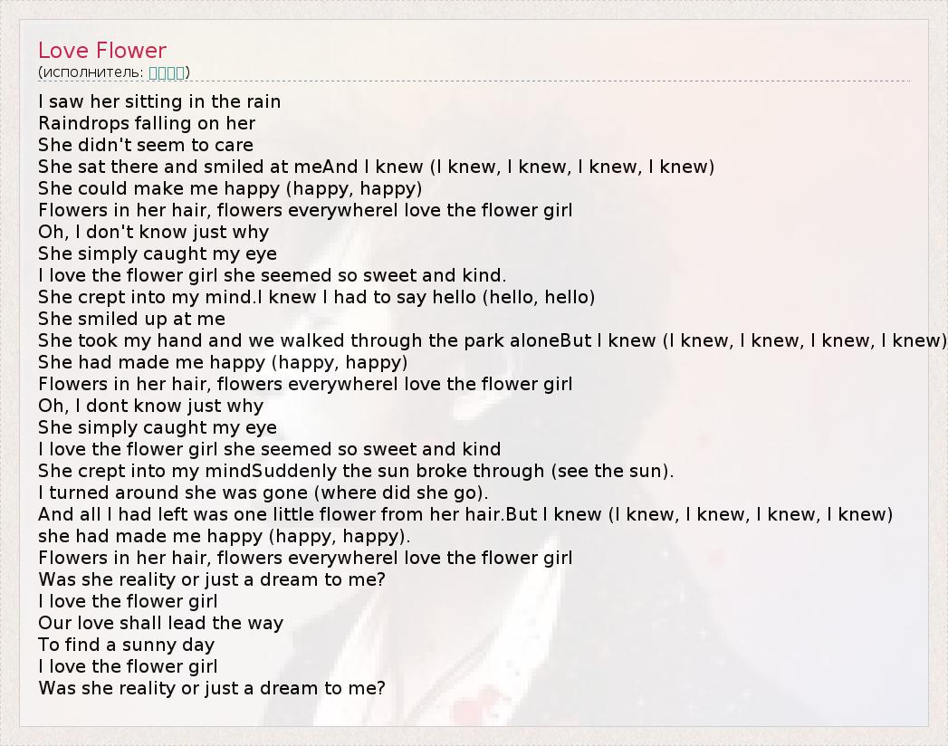 I saw her sitting in the rain Raindrops falling on her She didn't seem to care She sat there and smiled at meAnd I knew (I knew, I knew, I knew, I knew) She could make me happy (happy, happy) Flowers in her hair, flowers everywhereI love the flower girl Oh, I don't know just why She simply caught my eye I love the flower girl she seemed so sweet and kind. She crept into my mind.I knew I had to say hello (hello, hello) She smiled up at me She took my hand and we walked through the park aloneBut I knew (I knew, I knew, I knew, I knew) She had made me happy (happy, happy) Flowers in her hair, flowers everywhereI love the flower girl Oh, I dont know just why She simply caught my eye I love the flower girl she seemed so sweet and kind She crept into my mindSuddenly the sun broke through (see the sun). I turned around she was gone (where did she go). And all I had left was one little flower from her hair.But I knew (I knew, I knew, I knew, I knew) she had made me happy (happy, happy). Flowers in her hair, flowers everywhereI love the flower girl Was she reality or just a dream to me? I love the flower girl Our love shall lead the way To find a sunny day I love the flower girl Was she reality or just a dream to me?