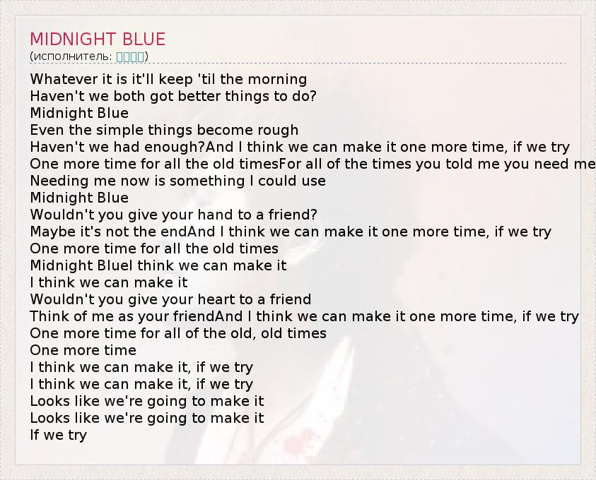 Whatever it is it'll keep 'til the morning Haven't we both got better things to do? Midnight Blue Even the simple things become rough Haven't we had enough?And I think we can make it one more time, if we try One more time for all the old timesFor all of the times you told me you need me Needing me now is something I could use Midnight Blue Wouldn't you give your hand to a friend? Maybe it's not the endAnd I think we can make it one more time, if we try One more time for all the old times Midnight BlueI think we can make it I think we can make it Wouldn't you give your heart to a friend Think of me as your friendAnd I think we can make it one more time, if we try One more time for all of the old, old times One more time I think we can make it, if we try I think we can make it, if we try Looks like we're going to make it Looks like we're going to make it If we try