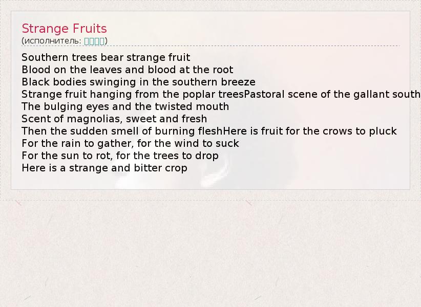 Southern trees bear strange fruit Blood on the leaves and blood at the root Black bodies swinging in the southern breeze Strange fruit hanging from the poplar treesPastoral scene of the gallant south The bulging eyes and the twisted mouth Scent of magnolias, sweet and fresh Then the sudden smell of burning fleshHere is fruit for the crows to pluck For the rain to gather, for the wind to suck For the sun to rot, for the trees to drop Here is a strange and bitter crop