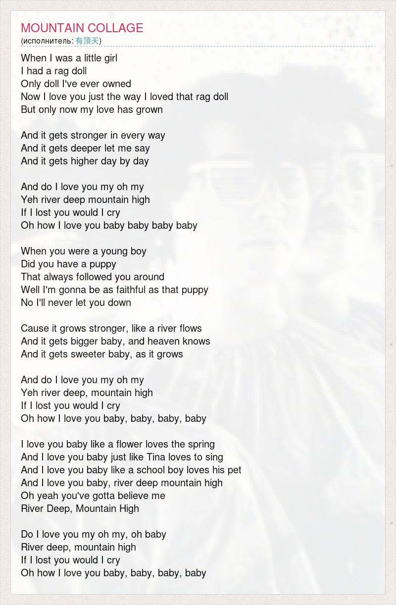 When I was a little girl I had a rag doll Only doll I've ever owned Now I love you just the way I loved that rag doll But only now my love has grown And it gets stronger in every way And it gets deeper let me say And it gets higher day by day And do I love you my oh my Yeh river deep mountain high If I lost you would I cry Oh how I love you baby baby baby baby When you were a young boy Did you have a puppy That always followed you around Well I'm gonna be as faithful as that puppy No I'll never let you down Cause it grows stronger, like a river flows And it gets bigger baby, and heaven knows And it gets sweeter baby, as it grows And do I love you my oh my Yeh river deep, mountain high If I lost you would I cry Oh how I love you baby, baby, baby, baby I love you baby like a flower loves the spring And I love you baby just like Tina loves to sing And I love you baby like a school boy loves his pet And I love you baby, river deep mountain high Oh yeah you've gotta believe me River Deep, Mountain High Do I love you my oh my, oh baby River deep, mountain high If I lost you would I cry Oh how I love you baby, baby, baby, baby