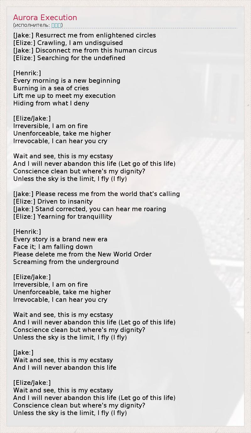 [Jake:] Воскреси меня из просвещенных кругов, [Elize:] Я подбираюсь не скрываясь, [Jake:] Отреши меня от этого человеческого цирка, [Elize:] В поисках неведанного. [Henrik:] Каждое утро – это новое начало, Пылающее в море воплей. Вознеси меня навстречу моей казни, Скрываясь, от чего я отрёкся. [Elize/Jake:] Необратимо, я весь горю, Неисполнимо, вознеси меня, Невозвратимо, я слышу твой крик. Подожди, и увидишь, это мой экстаз, И я никогда не отрекусь от этой жизни (Забуду эту жизнь). Совесть чиста, что где же моё самоуважение? И если небо не предел, я улечу (Я улечу). [Jake:] Прошу, оторви меня от мира, что взывает, [Elize:] Доведён до сумасшествия. [Jake:] Признай ошибку, ты слышишь мой рёв, [Elize:] Молящий о покое. [Henrik:] Каждая история – это совершенно новая эра, Посмотри правде в глаза; я падаю, Прошу, сотри меня из Нового Мирового Порядка, Голосящего из подполья. [Elize/Jake:] Необратимо, я весь горю, Неисполнимо, вознеси меня, Невозвратимо, я слышу твой крик. Подожди, и увидишь, это мой экстаз, И я никогда не отрекусь от этой жизни (Забуду эту жизнь). Совесть чиста, что где же моё самоуважение? И если небо не предел, я улечу (Я улечу). [Jake:] Подожди, и увидишь, это мой экстаз, И я никогда не отрекусь от этой жизни. [Elize/Jake:] Подожди, и увидишь, это мой экстаз, И я никогда не отрекусь от этой жизни (Забуду эту жизнь). Совесть чиста, что где же моё самоуважение? И если небо не предел, я улечу (Я улечу).