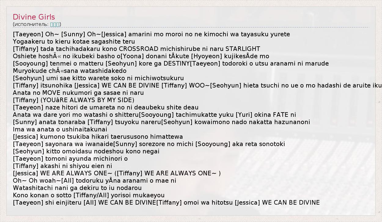 [Taeyeon] Oh~ [Sunny] Oh~[Jessica] amarini mo moroi no ne kimochi wa tayasuku yurete Yogaakeru to kieru kotae sagashite teru [Tiffany] tada tachihadakaru kono CROSSROAD michishirube ni naru STARLIGHT Oshiete hoshÄ« no ikubeki basho o[Yoona] donani tÅkute [Hyoyeon] kujikesÅde mo [Sooyoung] tenmei o matteru [Seohyun] kore ga DESTINY[Taeyeon] todoroki o utsu aranami ni marude Muryokude chÄ«sana watashidakedo [Seohyun] umi sae kitto warete soko ni michiwotsukuru [Tiffany] itsunohika [Jessica] WE CAN BE DIVINE [Tiffany] WOO~[Seohyun] hieta tsuchi no ue o mo hadashi de aruite iku Anata no MOVE nukumori ga sasae ni naru [Tiffany] (YOUâRE ALWAYS BY MY SIDE) [Taeyeon] naze hitori de umareta no ni deaubeku shite deau Anata wa dare yori mo watashi o shitteru[Sooyoung] tachimukatte yuku [Yuri] okina FATE ni [Sunny] anata tonaraba [Tiffany] tsuyoku nareru[Seohyun] kowaimono nado nakatta hazunanoni Ima wa anata o ushinaitakunai [Jessica] kumono tsukiba hikari taerususono himattewa [Taeyeon] sayonara wa iwanaide[Sunny] sorezore no michi [Sooyoung] aka reta sonotoki [Seohyun] kitto omoidasu nodeshou kono negai [Taeyeon] tomoni ayunda michinori o [Tiffany] akashi ni shiyou eien ni [Jessica] WE ARE ALWAYS ONE~ ([Tiffany] WE ARE ALWAYS ONE~ ) Oh~ Oh woah~[All] todoruku yÅna aranami o mae ni Watashitachi nani ga dekiru to iu nodarou Kono konan o sotto [Tiffany/All] yorisoi mukaeyou [Taeyeon] shi einjiteru [All] WE CAN BE DIVINE[Tiffany] omoi wa hitotsu [Jessica] WE CAN BE DIVINE