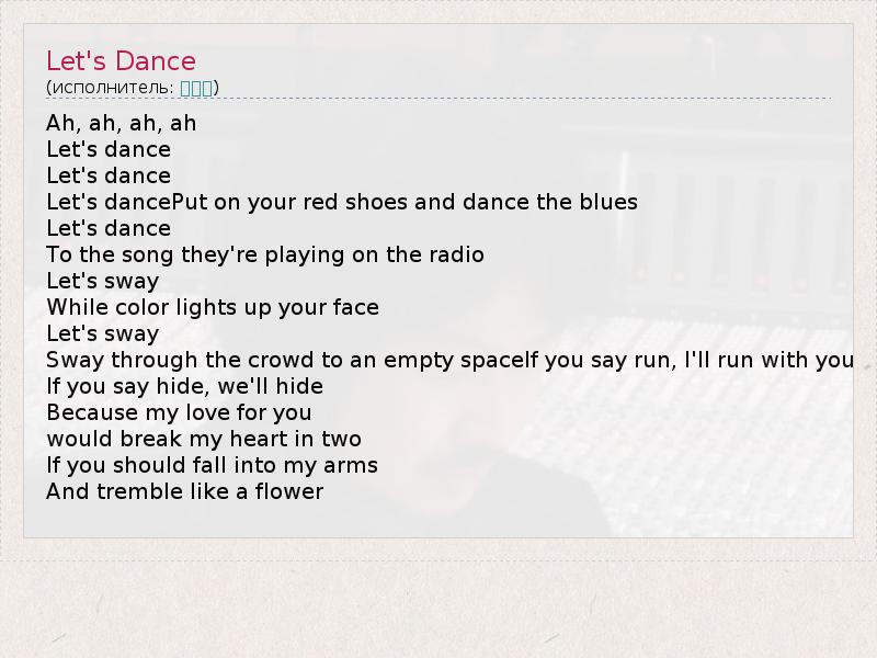 Ah, ah, ah, ah Let's dance Let's dance Let's dancePut on your red shoes and dance the blues Let's dance To the song they're playing on the radio Let's sway While color lights up your face Let's sway Sway through the crowd to an empty spaceIf you say run, I'll run with you If you say hide, we'll hide Because my love for you would break my heart in two If you should fall into my arms And tremble like a flower