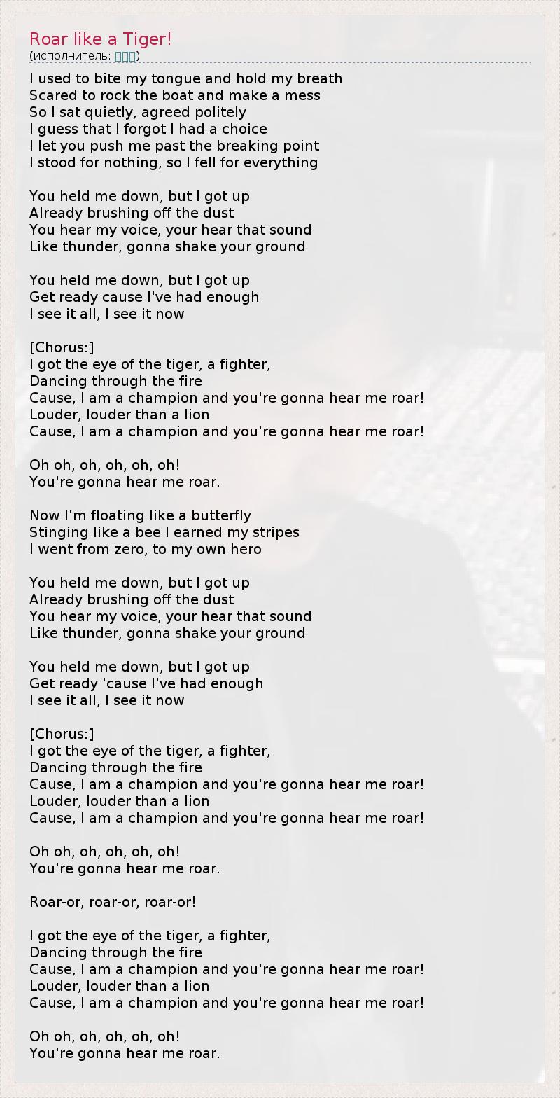 I used to bite my tongue and hold my breath Scared to rock the boat and make a mess So I sat quietly, agreed politely I guess that I forgot I had a choice I let you push me past the breaking point I stood for nothing, so I fell for everything You held me down, but I got up Already brushing off the dust You hear my voice, your hear that sound Like thunder, gonna shake your ground You held me down, but I got up Get ready cause I've had enough I see it all, I see it now [Chorus:] I got the eye of the tiger, a fighter, Dancing through the fire Cause, I am a champion and you're gonna hear me roar! Louder, louder than a lion Cause, I am a champion and you're gonna hear me roar! Oh oh, oh, oh, oh, oh! You're gonna hear me roar. Now I'm floating like a butterfly Stinging like a bee I earned my stripes I went from zero, to my own hero You held me down, but I got up Already brushing off the dust You hear my voice, your hear that sound Like thunder, gonna shake your ground You held me down, but I got up Get ready 'cause I've had enough I see it all, I see it now [Chorus:] I got the eye of the tiger, a fighter, Dancing through the fire Cause, I am a champion and you're gonna hear me roar! Louder, louder than a lion Cause, I am a champion and you're gonna hear me roar! Oh oh, oh, oh, oh, oh! You're gonna hear me roar. Roar-or, roar-or, roar-or! I got the eye of the tiger, a fighter, Dancing through the fire Cause, I am a champion and you're gonna hear me roar! Louder, louder than a lion Cause, I am a champion and you're gonna hear me roar! Oh oh, oh, oh, oh, oh! You're gonna hear me roar.