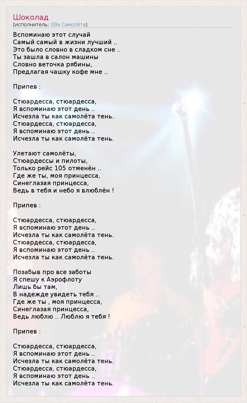 Вспоминаю этот случай Самый самый в жизни лучший .. Это было словно в сладком сне .. Ты зашла в салон машины Словно веточка рябины, Предлагая чашку кофе мне .. Припев : Стюардесса, стюардесса, Я вспоминаю этот день .. Исчезла ты как самолёта тень. Стюардесса, стюардесса, Я вспоминаю этот день .. Исчезла ты как самолёта тень. Улетают самолёты, Стюардессы и пилоты, Только рейс 105 отменён .. Где же ты, моя принцесса, Синеглазая принцесса, Ведь в тебя и небо я влюблён ! Припев : Стюардесса, стюардесса, Я вспоминаю этот день .. Исчезла ты как самолёта тень. Стюардесса, стюардесса, Я вспоминаю этот день .. Исчезла ты как самолёта тень. Позабыв про все заботы Я спешу к Аэрофлоту Лишь бы там, В надежде увидеть тебя .. Где же ты , моя принцесса, Синеглазая принцесса, Ведь люблю .. Люблю я тебя ! Припев : Стюардесса, стюардесса, Я вспоминаю этот день .. Исчезла ты как самолёта тень. Стюардесса, стюардесса, Я вспоминаю этот день .. Исчезла ты как самолёта тень.