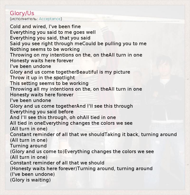 Это интересно:Acceptance - альтернативная рок-группа, образованная в Сиэтле в 1998 году. Их первый EP "Lost for Words" вышел в 2000 году, следующий - "Black Lines to Battlefields" - в 2003. Последняя пластинка "Phantoms" датирована 2005 годом.