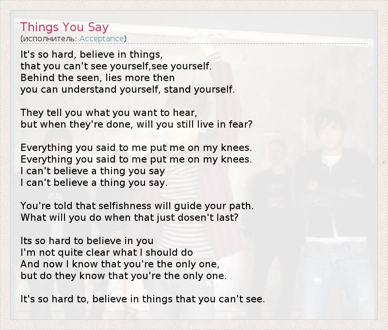 Это интересно:Acceptance - альтернативная рок-группа, образованная в Сиэтле в 1998 году. Их первый EP "Lost for Words" вышел в 2000 году, следующий - "Black Lines to Battlefields" - в 2003. Последняя пластинка "Phantoms" датирована 2005 годом.