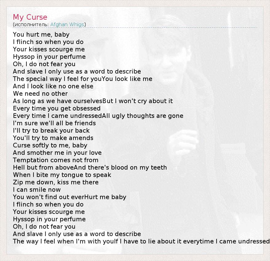 You hurt me, baby I flinch so when you do Your kisses scourge me Hyssop in your perfume Oh, I do not fear you And slave I only use as a word to describe The special way I feel for youYou look like me And I look like no one else We need no other As long as we have ourselvesBut I won't cry about it Every time you get obsessed Every time I came undressedAll ugly thoughts are gone I'm sure we'll all be friends I'll try to break your back You'll try to make amends Curse softly to me, baby And smother me in your love Temptation comes not from Hell but from aboveAnd there's blood on my teeth When I bite my tongue to speak Zip me down, kiss me there I can smile now You won't find out everHurt me baby I flinch so when you do Your kisses scourge me Hyssop in your perfume Oh, I do not fear you And slave I only use as a word to describe The way I feel when I'm with youIf I have to lie about it everytime I came undressed