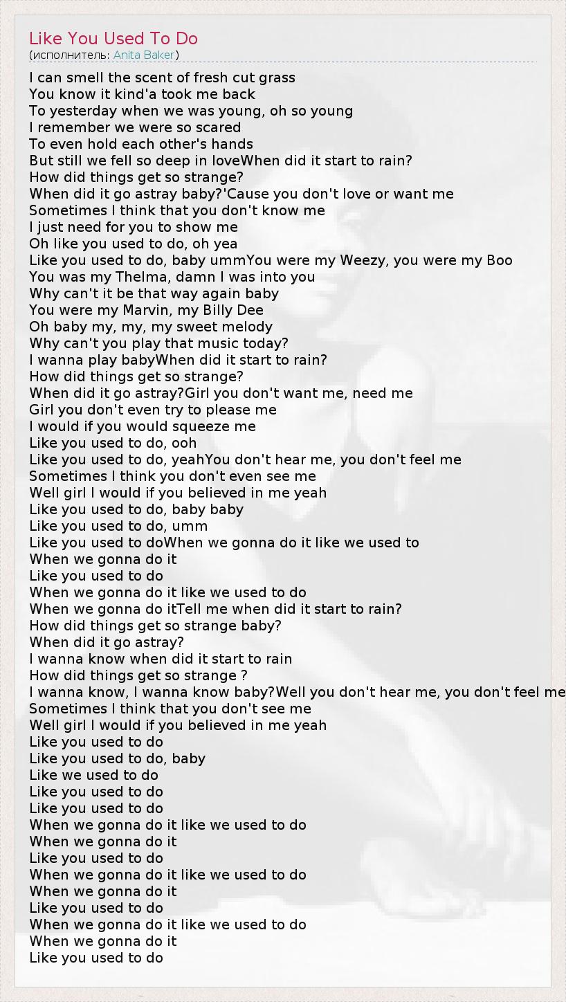 I can smell the scent of fresh cut grass You know it kind'a took me back To yesterday when we was young, oh so young I remember we were so scared To even hold each other's hands But still we fell so deep in loveWhen did it start to rain? How did things get so strange? When did it go astray baby?'Cause you don't love or want me Sometimes I think that you don't know me I just need for you to show me Oh like you used to do, oh yea Like you used to do, baby ummYou were my Weezy, you were my Boo You was my Thelma, damn I was into you Why can't it be that way again baby You were my Marvin, my Billy Dee Oh baby my, my, my sweet melody Why can't you play that music today? I wanna play babyWhen did it start to rain? How did things get so strange? When did it go astray?Girl you don't want me, need me Girl you don't even try to please me I would if you would squeeze me Like you used to do, ooh Like you used to do, yeahYou don't hear me, you don't feel me Sometimes I think you don't even see me Well girl I would if you believed in me yeah Like you used to do, baby baby Like you used to do, umm Like you used to doWhen we gonna do it like we used to When we gonna do it Like you used to do When we gonna do it like we used to do When we gonna do itTell me when did it start to rain? How did things get so strange baby? When did it go astray? I wanna know when did it start to rain How did things get so strange ? I wanna know, I wanna know baby?Well you don't hear me, you don't feel me Sometimes I think that you don't see me Well girl I would if you believed in me yeah Like you used to do Like you used to do, baby Like we used to do Like you used to do Like you used to do When we gonna do it like we used to do When we gonna do it Like you used to do When we gonna do it like we used to do When we gonna do it Like you used to do When we gonna do it like we used to do When we gonna do it Like you used to do