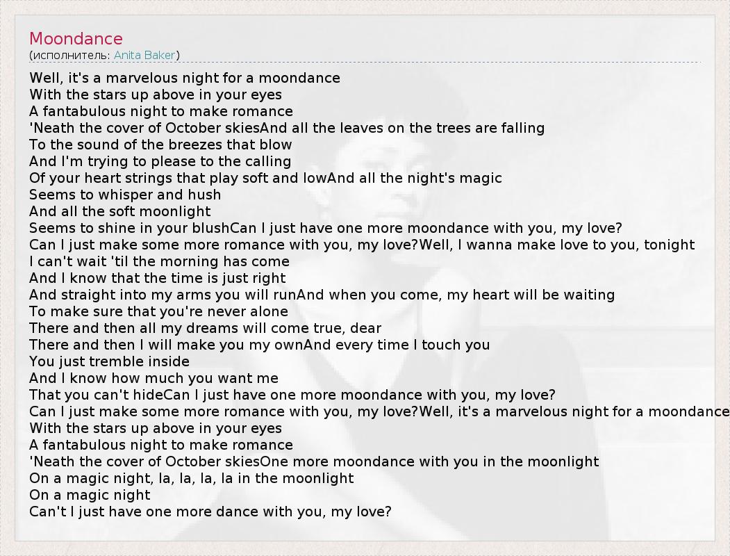 Well, it's a marvelous night for a moondance With the stars up above in your eyes A fantabulous night to make romance 'Neath the cover of October skiesAnd all the leaves on the trees are falling To the sound of the breezes that blow And I'm trying to please to the calling Of your heart strings that play soft and lowAnd all the night's magic Seems to whisper and hush And all the soft moonlight Seems to shine in your blushCan I just have one more moondance with you, my love? Can I just make some more romance with you, my love?Well, I wanna make love to you, tonight I can't wait 'til the morning has come And I know that the time is just right And straight into my arms you will runAnd when you come, my heart will be waiting To make sure that you're never alone There and then all my dreams will come true, dear There and then I will make you my ownAnd every time I touch you You just tremble inside And I know how much you want me That you can't hideCan I just have one more moondance with you, my love? Can I just make some more romance with you, my love?Well, it's a marvelous night for a moondance With the stars up above in your eyes A fantabulous night to make romance 'Neath the cover of October skiesOne more moondance with you in the moonlight On a magic night, la, la, la, la in the moonlight On a magic night Can't I just have one more dance with you, my love?
