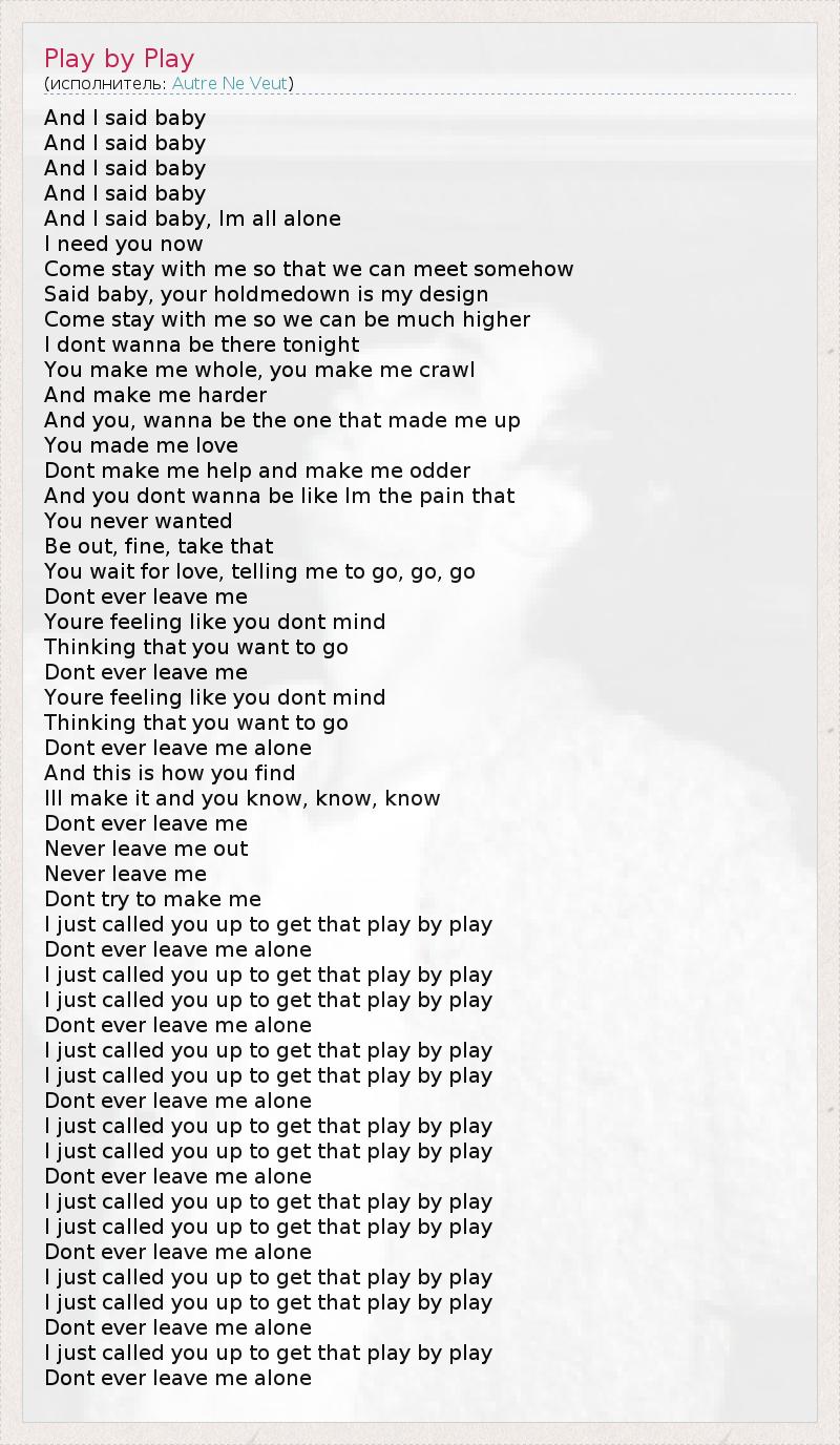 And I said baby And I said baby And I said baby And I said baby And I said baby, Im all alone I need you now Come stay with me so that we can meet somehow Said baby, your holdmedown is my design Come stay with me so we can be much higher I dont wanna be there tonight You make me whole, you make me crawl And make me harder And you, wanna be the one that made me up You made me love Dont make me help and make me odder And you dont wanna be like Im the pain that You never wanted Be out, fine, take that You wait for love, telling me to go, go, go Dont ever leave me Youre feeling like you dont mind Thinking that you want to go Dont ever leave me Youre feeling like you dont mind Thinking that you want to go Dont ever leave me alone And this is how you find Ill make it and you know, know, know Dont ever leave me Never leave me out Never leave me Dont try to make me I just called you up to get that play by play Dont ever leave me alone I just called you up to get that play by play I just called you up to get that play by play Dont ever leave me alone I just called you up to get that play by play I just called you up to get that play by play Dont ever leave me alone I just called you up to get that play by play I just called you up to get that play by play Dont ever leave me alone I just called you up to get that play by play I just called you up to get that play by play Dont ever leave me alone I just called you up to get that play by play I just called you up to get that play by play Dont ever leave me alone I just called you up to get that play by play Dont ever leave me alone