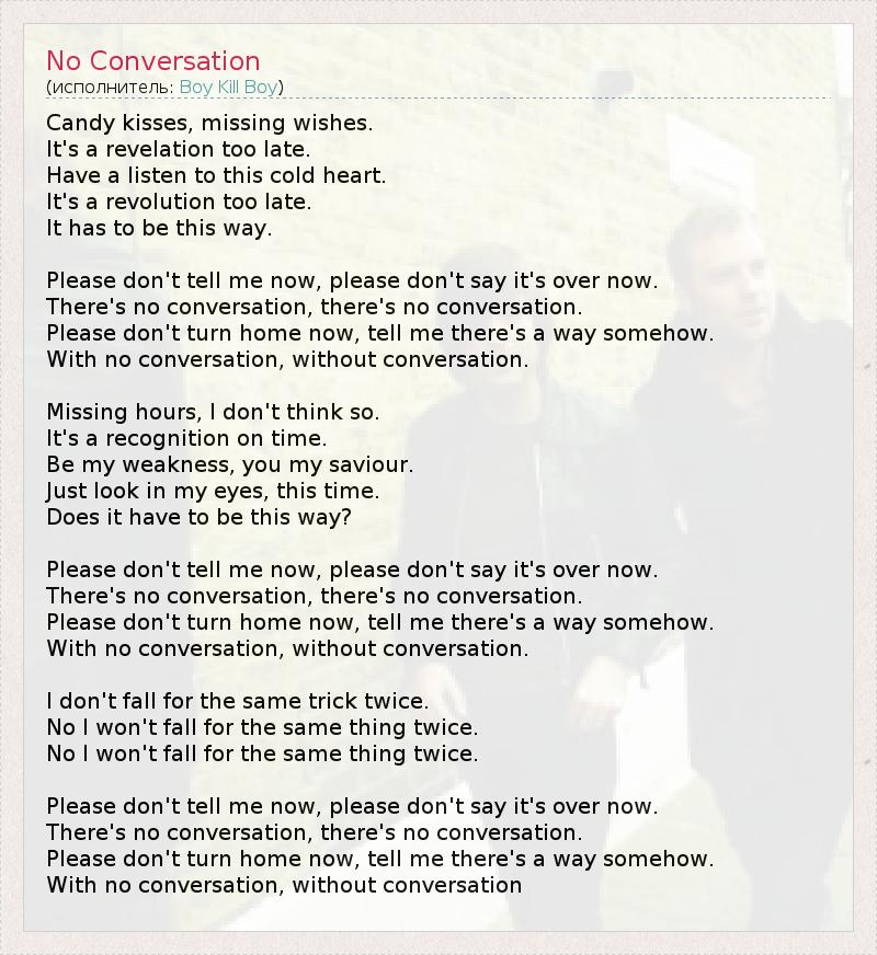 Candy kisses, missing wishes. It's a revelation too late. Have a listen to this cold heart. It's a revolution too late. It has to be this way. Please don't tell me now, please don't say it's over now. There's no conversation, there's no conversation. Please don't turn home now, tell me there's a way somehow. With no conversation, without conversation. Missing hours, I don't think so. It's a recognition on time. Be my weakness, you my saviour. Just look in my eyes, this time. Does it have to be this way? Please don't tell me now, please don't say it's over now. There's no conversation, there's no conversation. Please don't turn home now, tell me there's a way somehow. With no conversation, without conversation. I don't fall for the same trick twice. No I won't fall for the same thing twice. No I won't fall for the same thing twice. Please don't tell me now, please don't say it's over now. There's no conversation, there's no conversation. Please don't turn home now, tell me there's a way somehow. With no conversation, without conversation