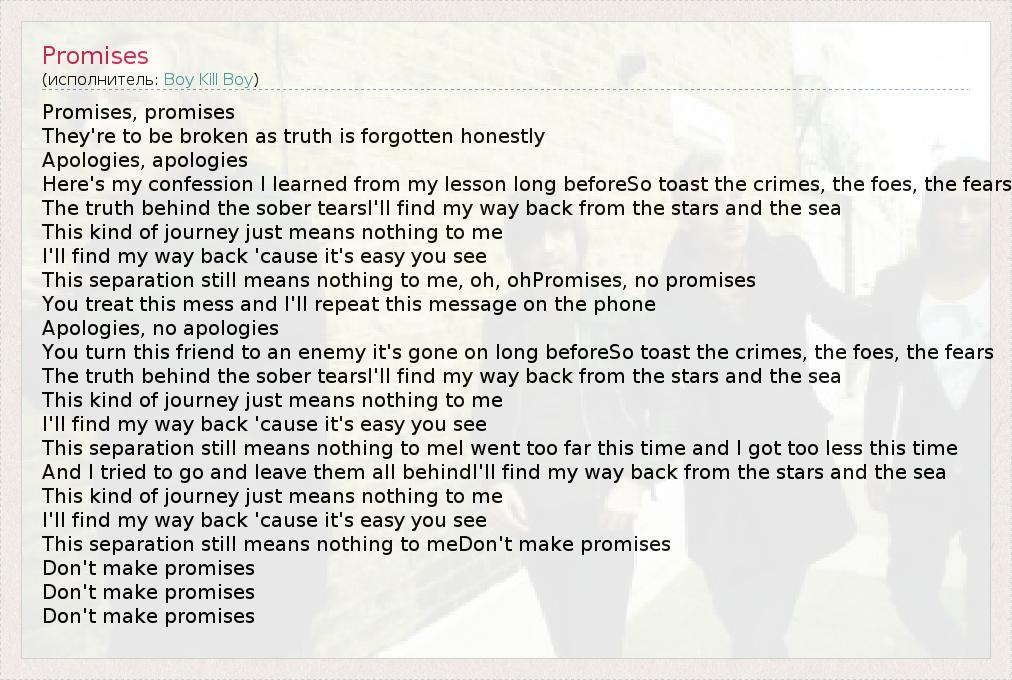 Promises, promises They're to be broken as truth is forgotten honestly Apologies, apologies Here's my confession I learned from my lesson long beforeSo toast the crimes, the foes, the fears The truth behind the sober tearsI'll find my way back from the stars and the sea This kind of journey just means nothing to me I'll find my way back 'cause it's easy you see This separation still means nothing to me, oh, ohPromises, no promises You treat this mess and I'll repeat this message on the phone Apologies, no apologies You turn this friend to an enemy it's gone on long beforeSo toast the crimes, the foes, the fears The truth behind the sober tearsI'll find my way back from the stars and the sea This kind of journey just means nothing to me I'll find my way back 'cause it's easy you see This separation still means nothing to meI went too far this time and I got too less this time And I tried to go and leave them all behindI'll find my way back from the stars and the sea This kind of journey just means nothing to me I'll find my way back 'cause it's easy you see This separation still means nothing to meDon't make promises Don't make promises Don't make promises Don't make promises