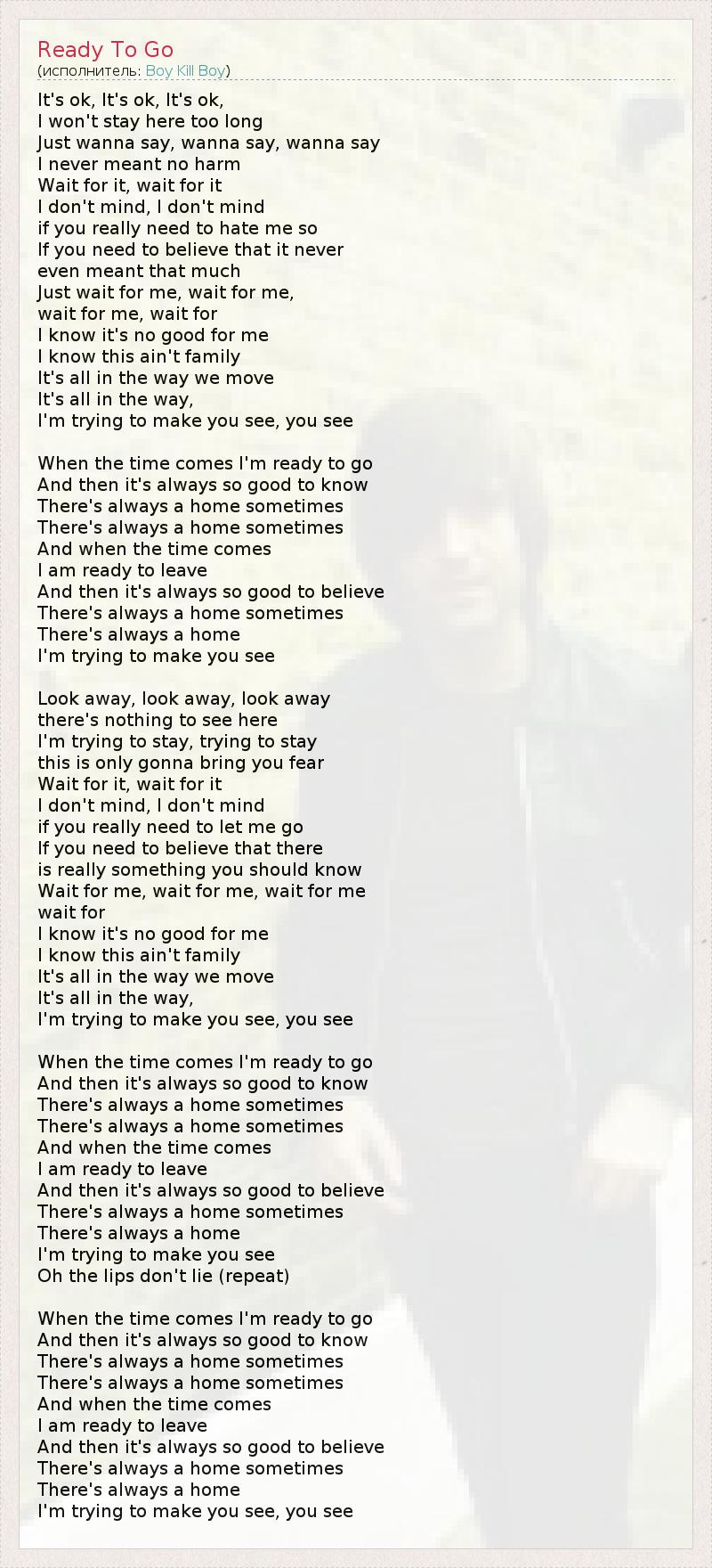 Всё в порядке, всё в порядке, всё в порядке Я не останусь здесь надолго Только хочу сказать, хочу сказать, хочу сказать Я никогда не хотел навредить Подожди, подожди Мне всё равно Если тебе, действительно, нужно так меня ненавидеть Если тебе нужно верить, что это никогда Не было важным Только подожди меня, подожди меня Подожди меня, подожди меня Я знаю, это плохо для меня Я знаю, это не семья В этом направлении мы движемся В этом направлении Я пытаюсь дать тебе понять, тебе понять Когда придёт время, я готов уйти И ещё, всегда так хорошо знать это Всегда дом иногда Всегда дом иногда И когда придёт время Я готов уйти И ещё, всегда так хорошо верить Всегда дом иногда Всегда дом Я пытаюсь дать тебе понять Оглянись, оглянись, оглянись Здесь нечего смотреть Я пытаюсь остаться, пытаюсь остаться Это только унесёт твой страх Подожди, подожди Мне всё равно, мне всё равно Если тебе, действительно, нужно отпустить меня Если тебе нужно верить, что Есть что-то, что тебе нужно знать Подожди меня, подожди меня, подожди меня Подожди Я знаю, это плохо для меня Я знаю, это не семья В этом направлении мы движемся В этом направлении Я пытаюсь дать тебе понять, тебе понять Когда придёт время, я готов уйти И ещё, всегда так хорошо знать это Всегда дом иногда Всегда дом иногда И когда придёт время Я готов уйти И ещё, всегда так хорошо верить Всегда дом иногда Всегда дом Я пытаюсь дать тебе понять О, губы не врут (повторять) Когда придёт время, я готов уйти И ещё, всегда так хорошо знать это Всегда дом иногда Всегда дом иногда И когда придёт время Я готов уйти И ещё, всегда так хорошо верить Всегда дом иногда Всегда дом Я пытаюсь дать тебе понять, тебе понять